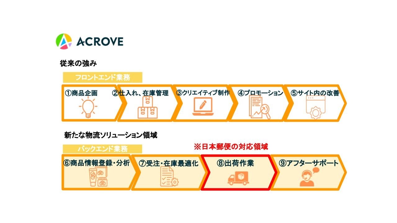 今回、ACROVEは日本郵便とのパートナー連携強化を通じ、お客様企業の商品企画からECモールサイト内の改善というフロントエンド業務に加えて、物流における商品情報登録からアフターサポートというバックエンド業務までACROVEで改善・販売促進増大をサポートする事が可能となります。