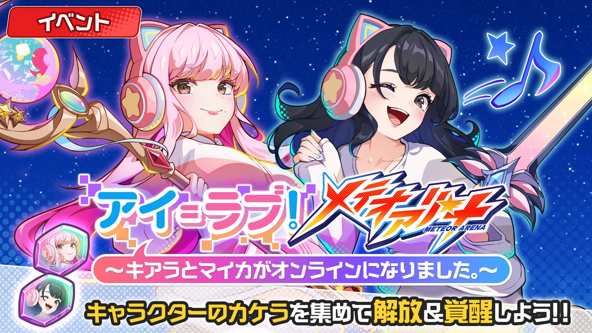 株式会社でらゲー(本社:東京都渋谷区、代表取締役:家次栄一、以下「でらゲー」)は、株式会社テレビ朝日(本社:東京都港区、代表取締役会長:早河洋、以下「テレビ朝日」)と共同開発中のスマートフォンゲーム『メテオアリーナ』において、初のコラボイベント「アイ=ラブ!メテオアリーナ ~キアラとマイカがオンラインになりました。~」が開始したことをお知らせします。