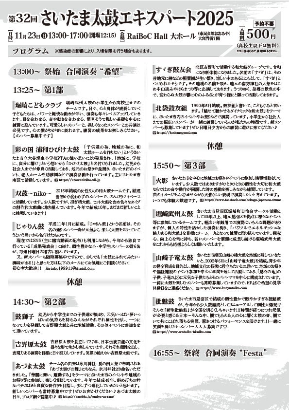 【さいたま市】11/23(日)「第32回さいたま太鼓エキスパート2025」RaiBoC Hallで開催