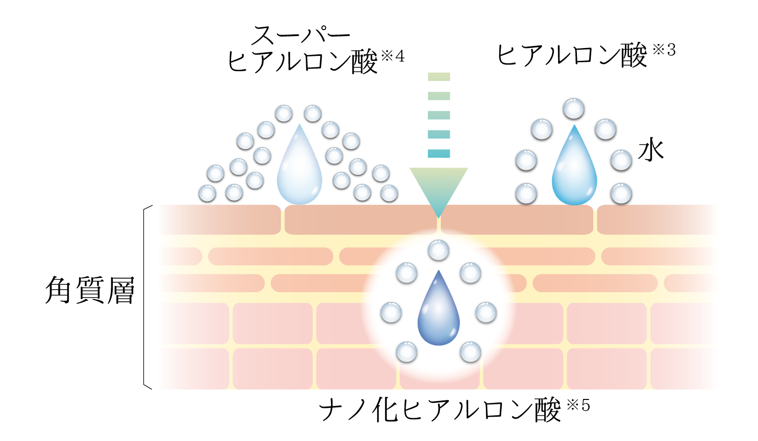 米ぬか美人シリーズの共通成分である「米ぬか※1」、「日本酒※2」に加えて、ヒアルロン酸※3・スーパーヒアルロン酸※4・ナノ化ヒアルロン酸※5の3種類のヒアルロン酸を配合することにより、肌の外側と内側(角質層)から保湿し、肌にしっかりとうるおいを与えることで、もっちりとした肌へと導きます。