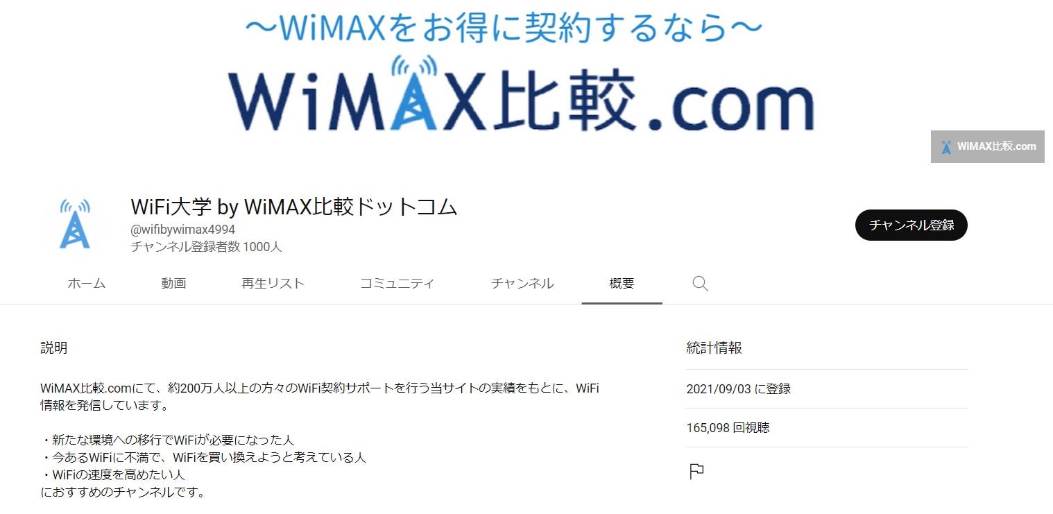 WiMAX比較.comでは、契約者数3,200万人超の人気ポケット型WiFi「WiMAX」をはじめ、ポケット型WiFiやホームルーターなどインターネット回線にまつわる最新情報を網羅的にご紹介しています。「WiFi大学 by WiMAX比較ドットコム」はWiMAX比較.comの動画コンテンツとして、2021年11月にローンチし、通信端末の最新レビューや最新料金プランの比較結果などを動画で伝えてまいりました。今回、チャンネル登録者数が1,000人を突破