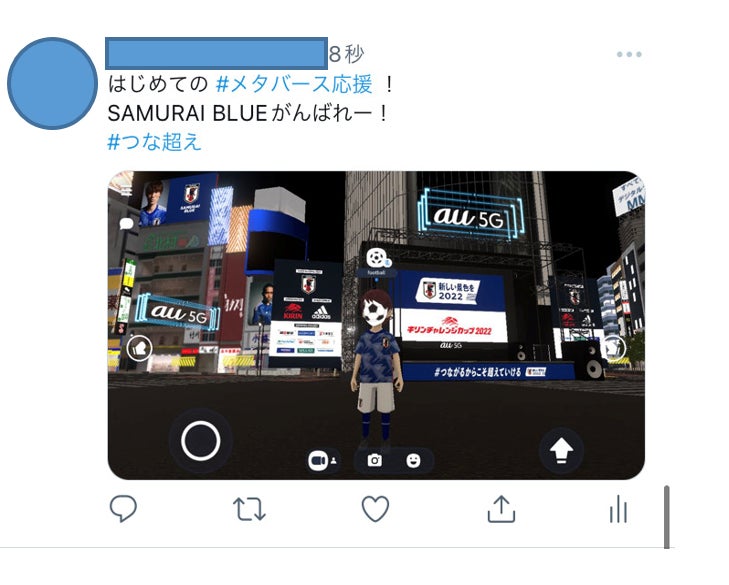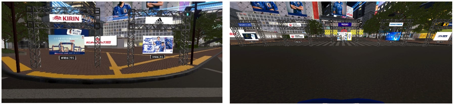 本イベントは、サッカー日本代表スポンサー各社と連携した「新しい景色を2022 つながる!パブリックビューイング」と連動したもので、サッカー日本代表の特別仕様で彩られたバーチャル渋谷のメタバース空間で参加者がつながり、ドイツで戦う日本代表を応援する企画です。