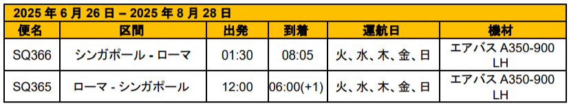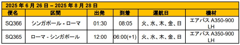 2025年6月26日から2025年8月28日まで、SQ366便とSQ365便はシンガポール - ローマ間を現在の週4便から週5便で運航します。