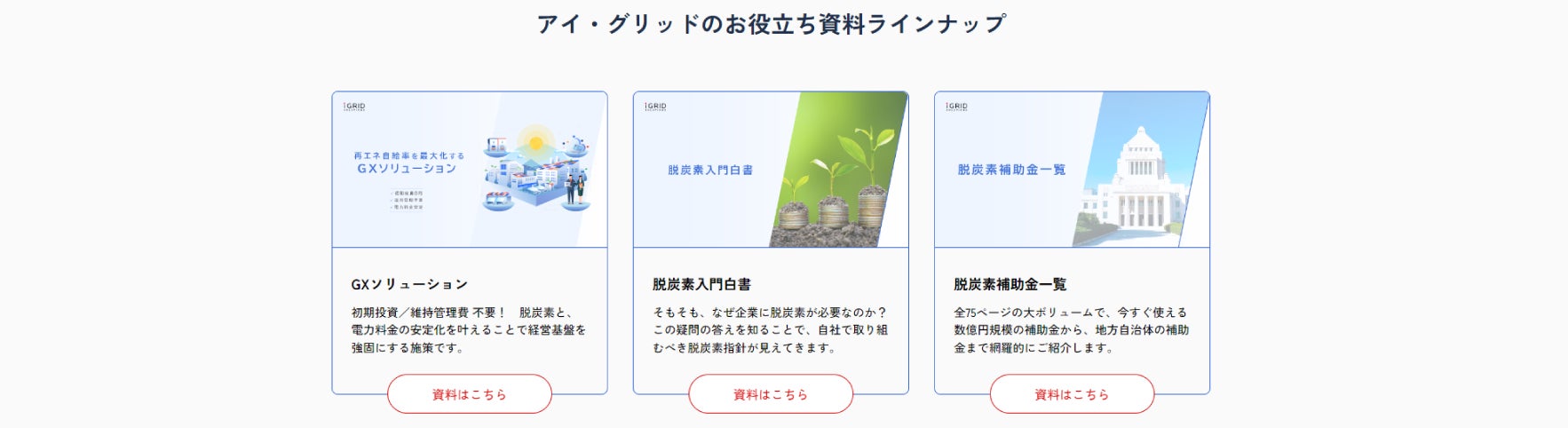 太陽光オンサイトPPA、蓄電池、R.E.A.L. New Energy Platform(AIプラットフォーム)、EV急速充電など、アイ・グリッドのGXソリューションについて、それぞれの特徴や導入メリットを紹介。さらに詳細を知りたい方は、資料入手や無料相談をすることができるようになっています。