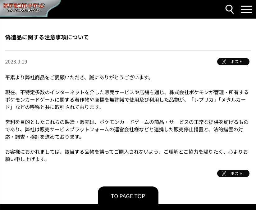 この事態を重く見た「ポケモンカードゲーム」は2023年9月、公式ホームページにて注意喚起を促す声明を発表。