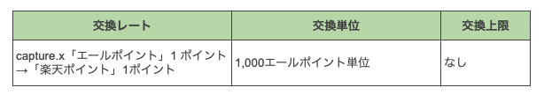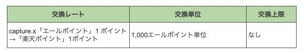 「capture.x」内で貯めた「エールポイント」を以下の条件で「楽天ポイント」(期間限定ポイント)に交換いただけます。なお交換レートは各種キャンペーンに応じて、増減いたしますので、あらかじめご了承ください。下記レートのキャンペーン期間は、2023年9月30日までとなります。