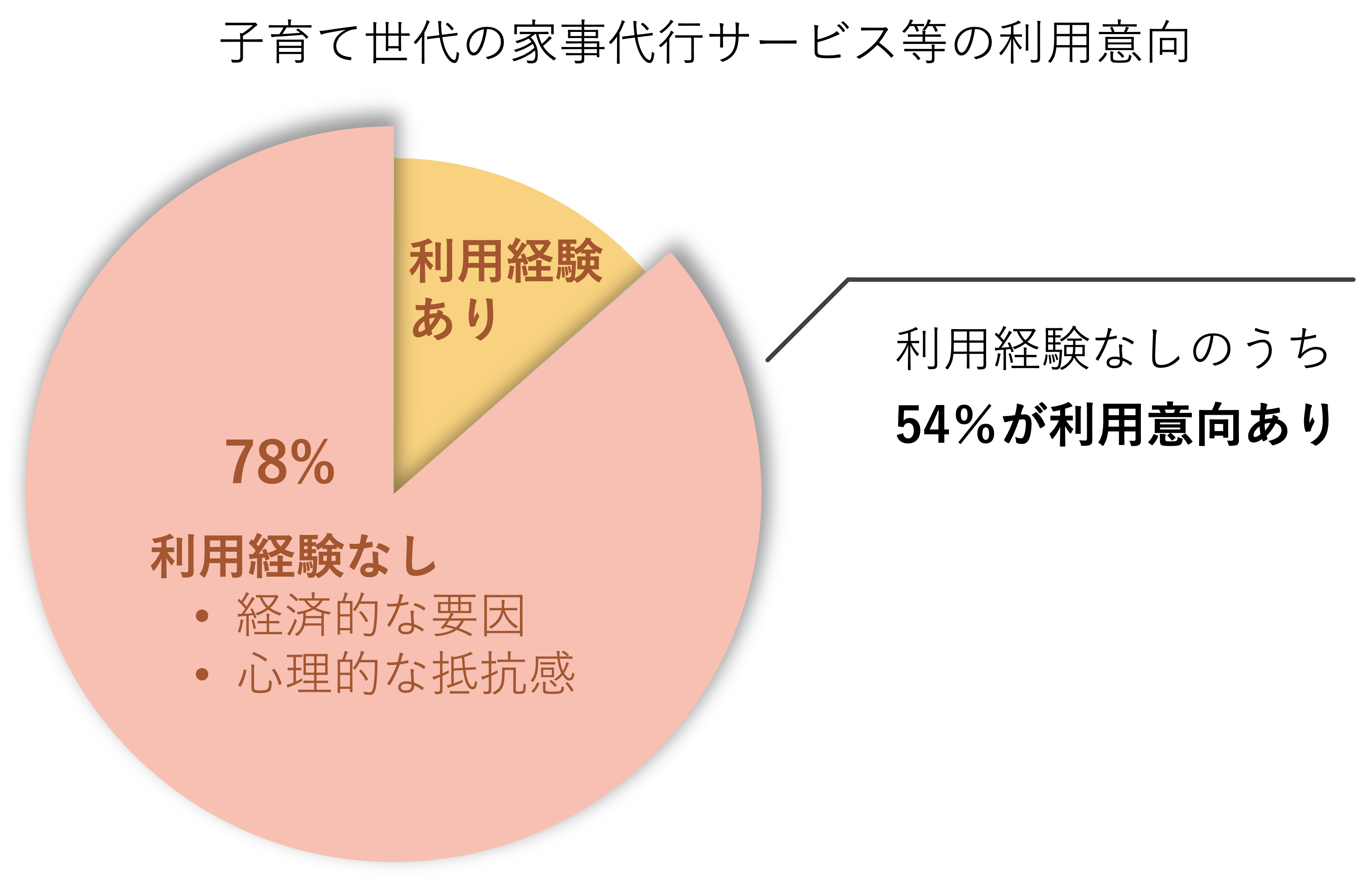 第一生命と第一スマートが子育て世代を対象に実施した調査※によると、家事代行サービス等の利用経験のない人々のうち、その約半数が「今後の家事代行サービス等の利用意向あり」と回答しています。また、家事代行サービス等を利用していない主な理由として、「経済的な要因」や「未経験であることによる心理的な抵抗感」があることが分かりました。