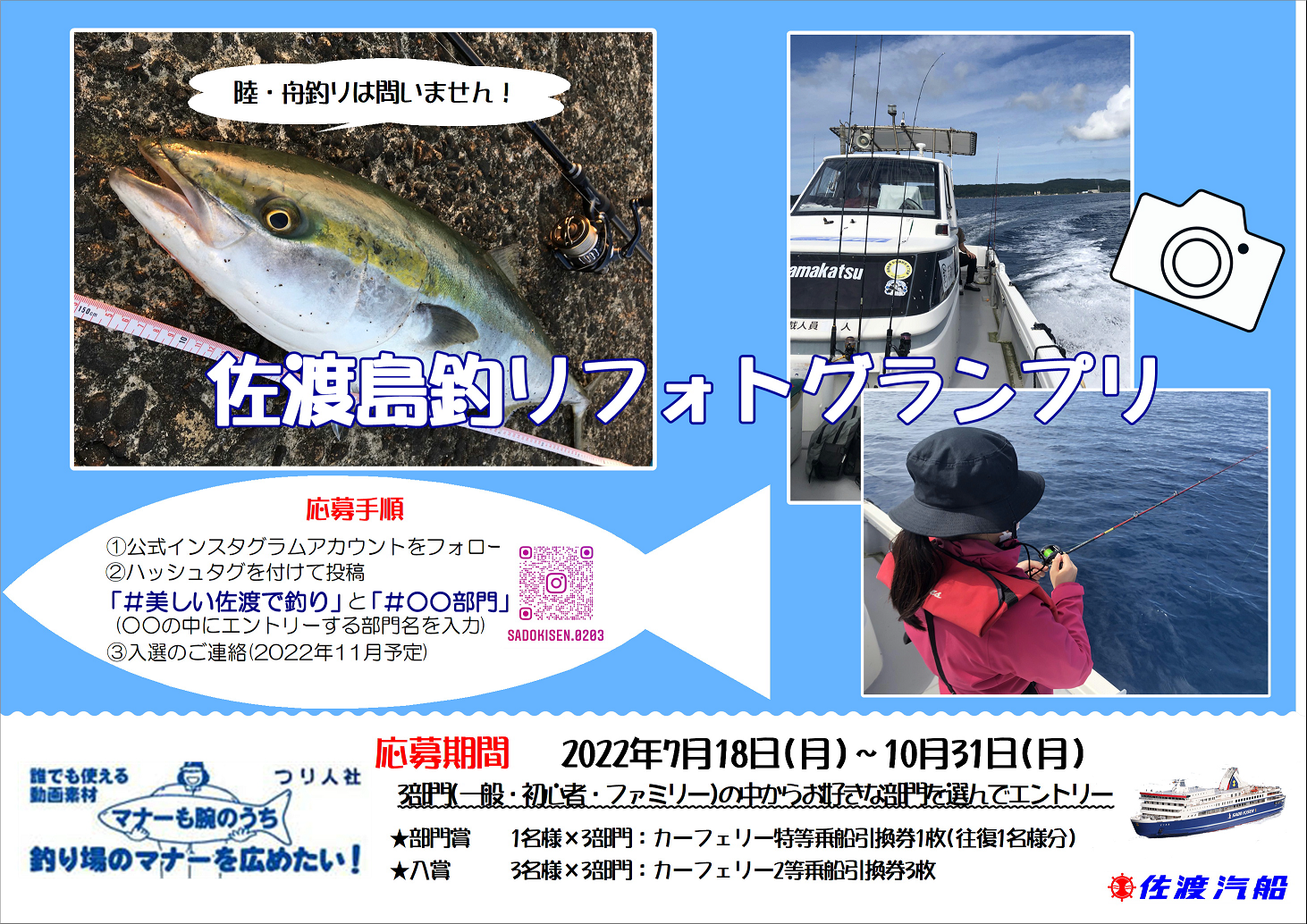 佐渡汽船株式会社(本社:新潟県佐渡市、代表取締役社長:尾渡英生)は、海の日(7/18)にちなんで「佐渡島・釣りフォトグランプリ」を開催いたします。佐渡で感じた釣りの魅力をInstagramで共有して頂き、全国各地の釣り人との思い出づくりにご活用ください。部門賞・入賞には、景品(特等乗船引換券、2等乗船引換券)をご用意しております。ターゲットとなる魚種、釣り方(ルアー・エサ)等の条件は問いませんので、たくさんのご参加をお待ちしております。
