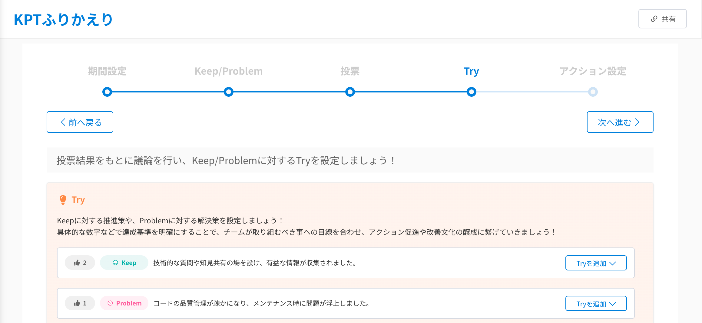 (画像:期間設定、Keep/Ploblem、投票、Try、アクション設定の5ステップ)