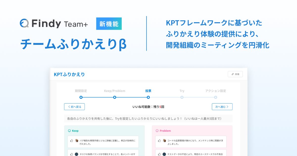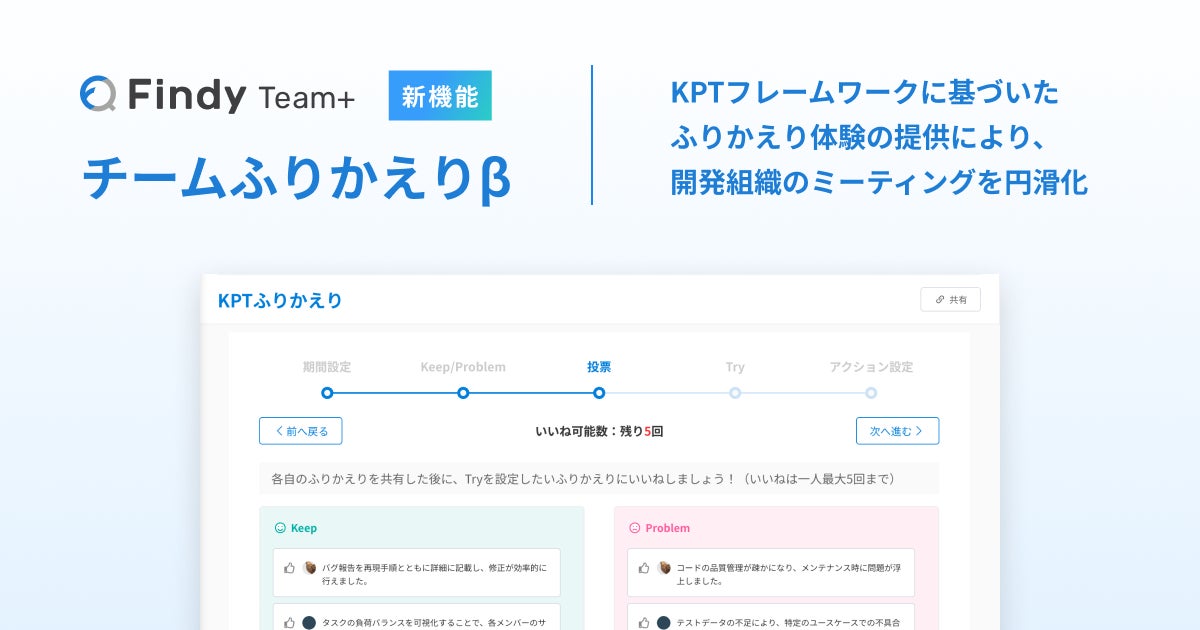 上記に対応する新機能「チームふりかえりβ」として、期間設定、Keep/Ploblem、投票、Try、アクション設定の5ステップを実装いたしました。今後も「挑戦するエンジニアのプラットフォームをつくる。」を実現すべく、ご利用企業のお声を反映させた各種機能を順次アップデート予定です。