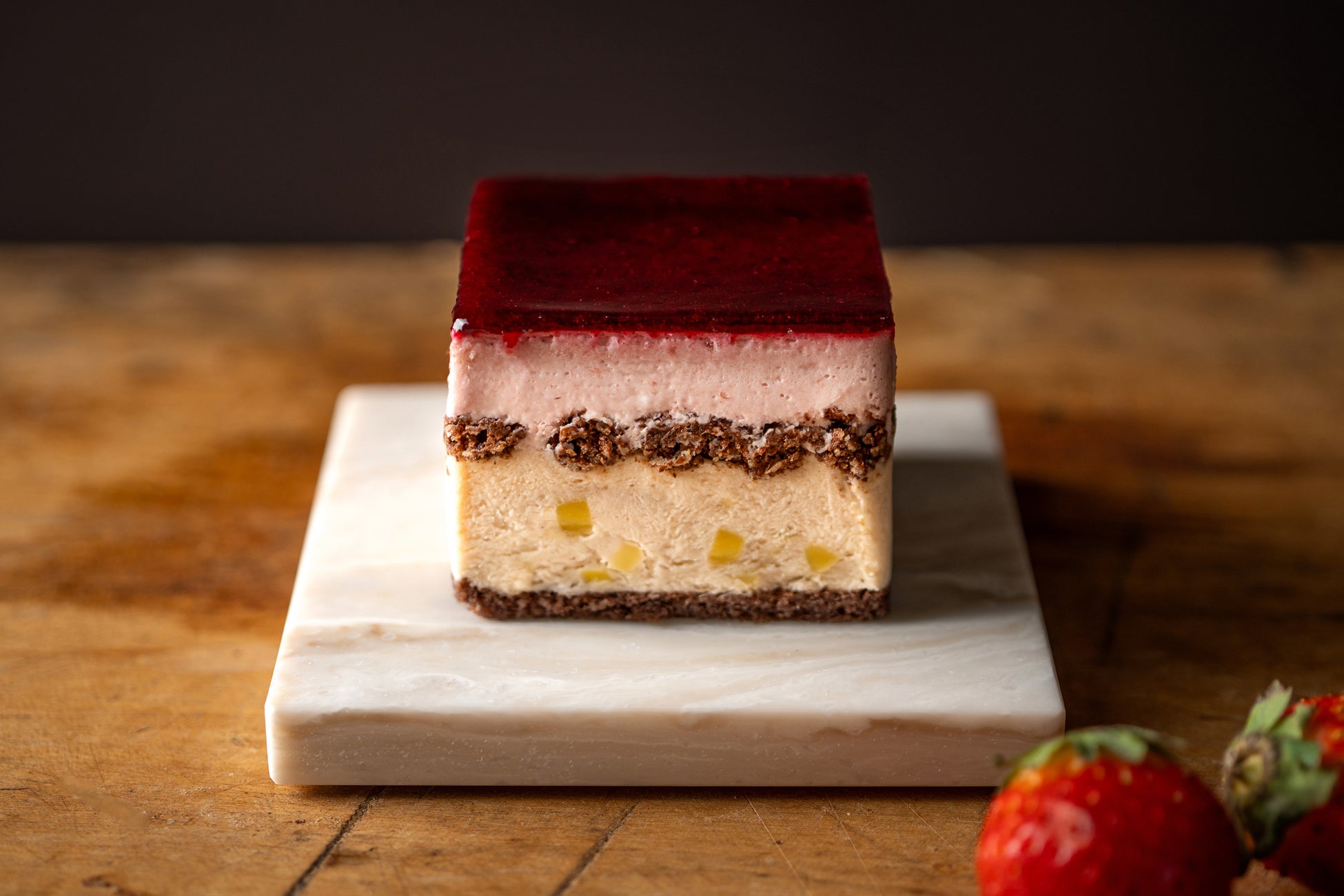 酸味と甘さのバランスのよい、5層に重ねたスクエア型の新作のムースケーキです。ショコラ生地、栗の粒を閉じこめたマロンムース、サクサクのチョコフィアンティーヌ、いちごのムース、トップをカシスのグラサージュで仕上げました。