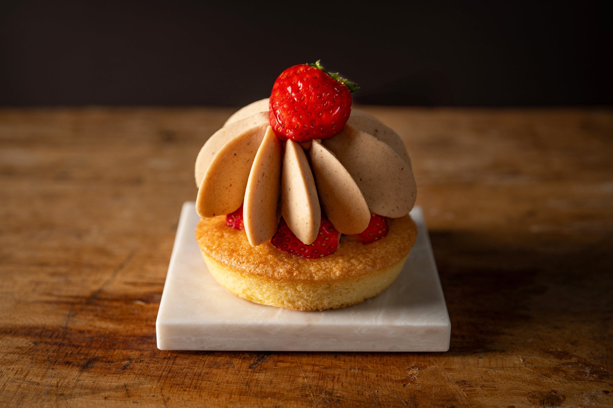 定番の「いちごのタルト」の新フレーバー。アーモンドの風味豊かな自家製タルト生地に、ラムレーズンとフレッシュいちごをトッピング。花びらに見立てた濃厚なマロンクリームを絞った季節限定のタルトです。