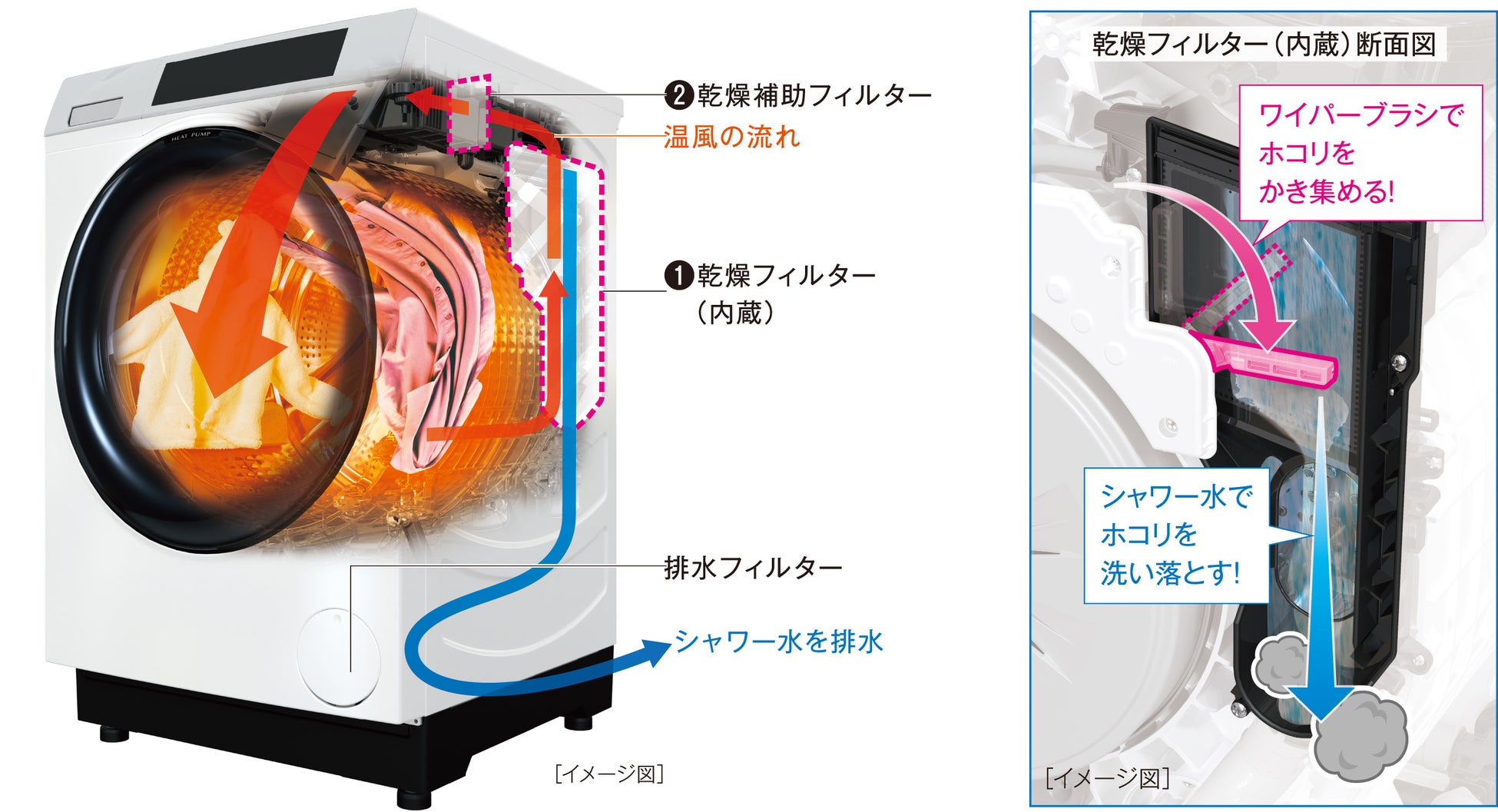 また、内蔵の乾燥フィルターから流れた水はフィルターだけでなく、内部のホコリが溜まりやすい部分もまとめて洗い流し、乾燥風路内を常にキレイに保ちます。この糸くずやホコリが溜まりづらい構造により、経年による乾燥性能の低下を防ぎます。