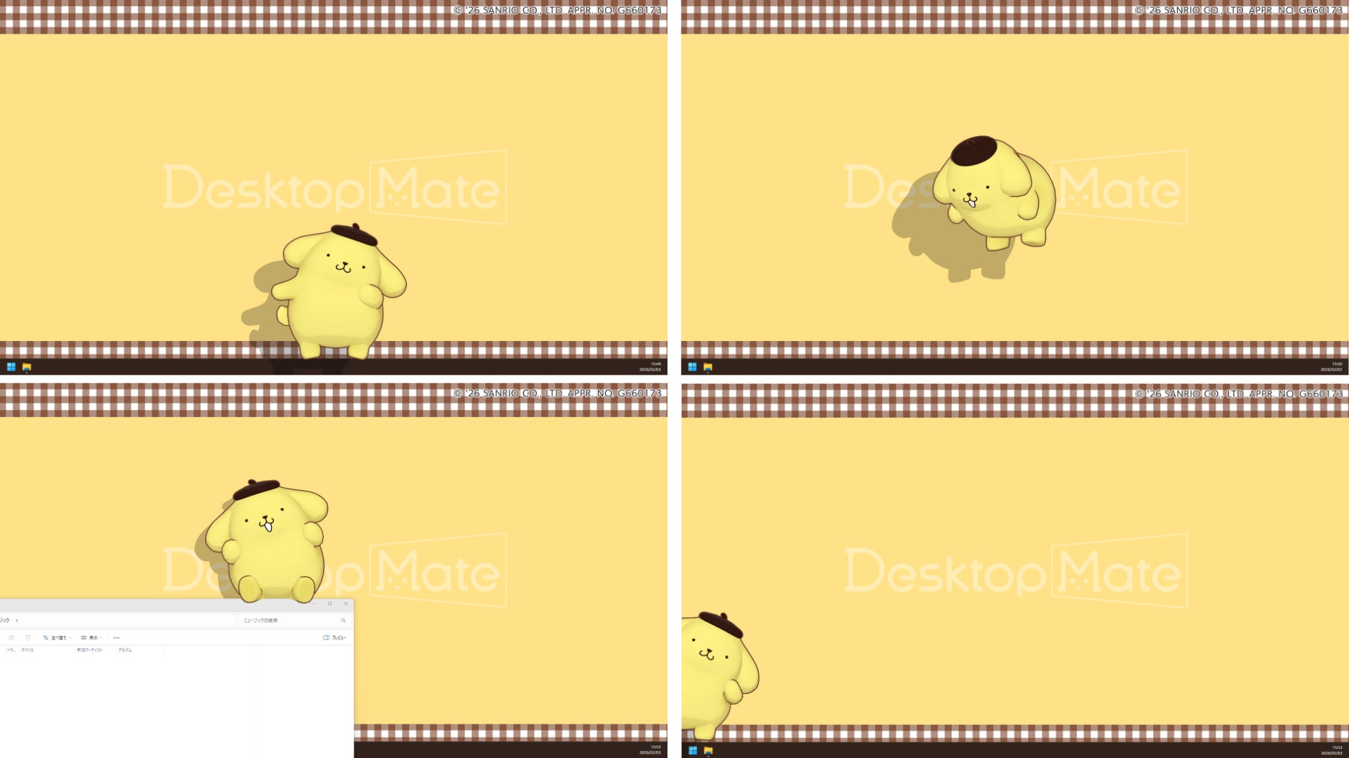 2025年サンリオキャラクター大賞1位!大人気キャラクター「ポムポムプリン」がDesktop Mateについに登場!こげ茶色のベレー帽がトレードマークのゴールデンレトリバーの男のコ。好きな言葉は「おでかけ」、嫌いな言葉は「おるすばん」。そんなのんびり屋のポムポムプリンが、あなたのデスクトップにやってきます。