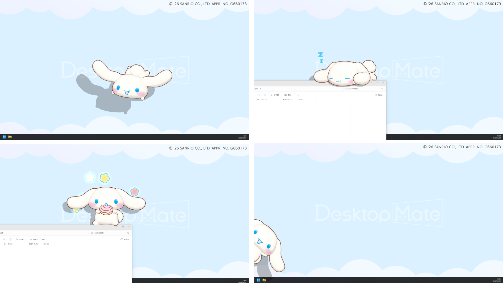 サンリオキャラクターズから、世界中で愛される「ハローキティ」「ポムポムプリン」「シナモロール」「ポチャッコ」「マイメロディ」「クロミ」がDesktop Mateに登場。今回のDesktop Mate DLCでは、それぞれのキャラクターの魅力が詰まったモーションとキャラクターボイスで、あなたのデスクトップを彩ります。