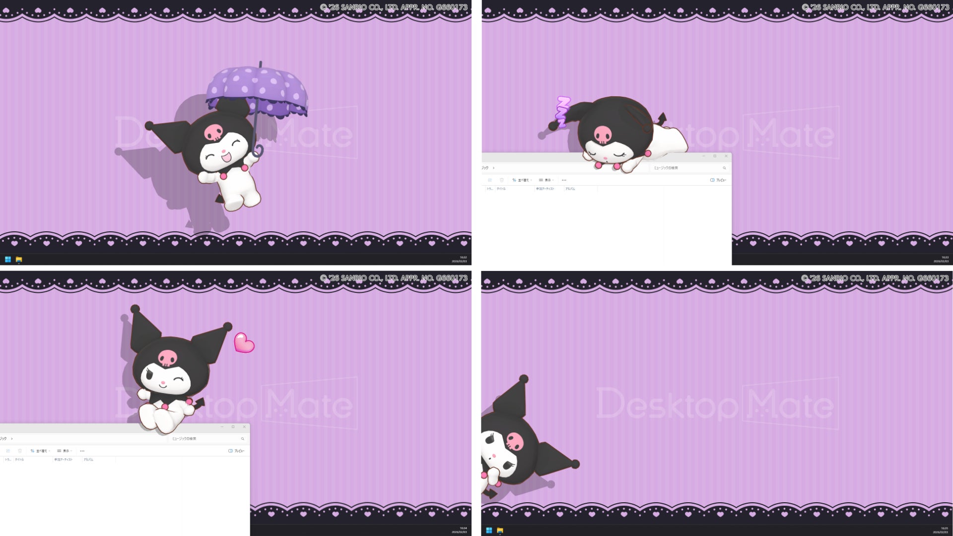 世界中で人気急上昇中!自称マイメロディのライバル「クロミ」がDesktop Mateについに登場!乱暴者に見えるけれど、実はとっても乙女チック!? 黒いずきんとピンクのどくろがチャームポイント。世界中をクロミ化するため奮闘中のクロミが、あなたのデスクトップにやってきます。
