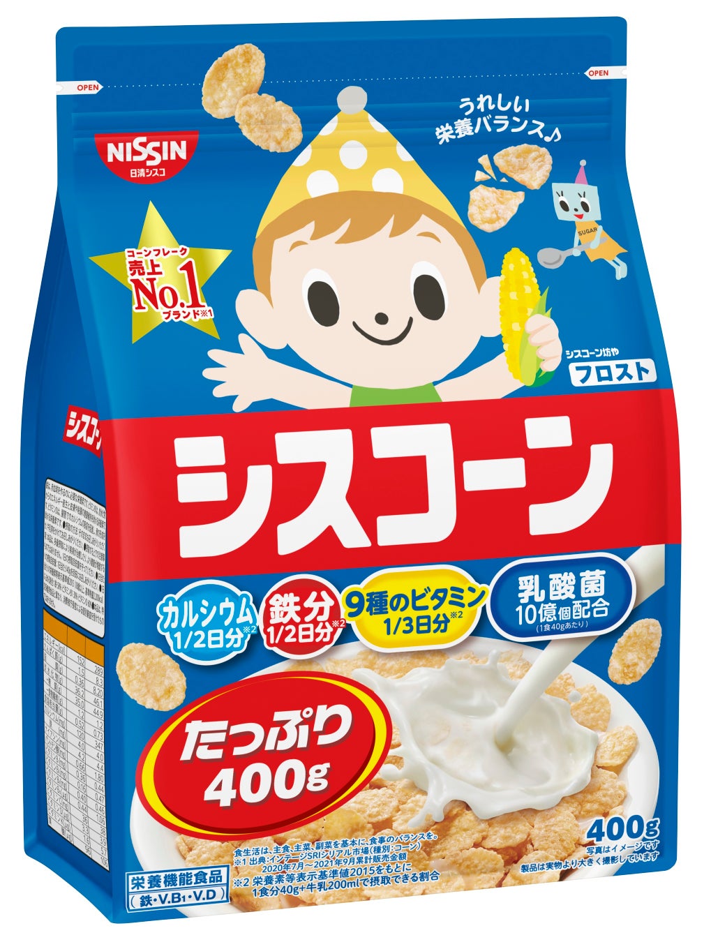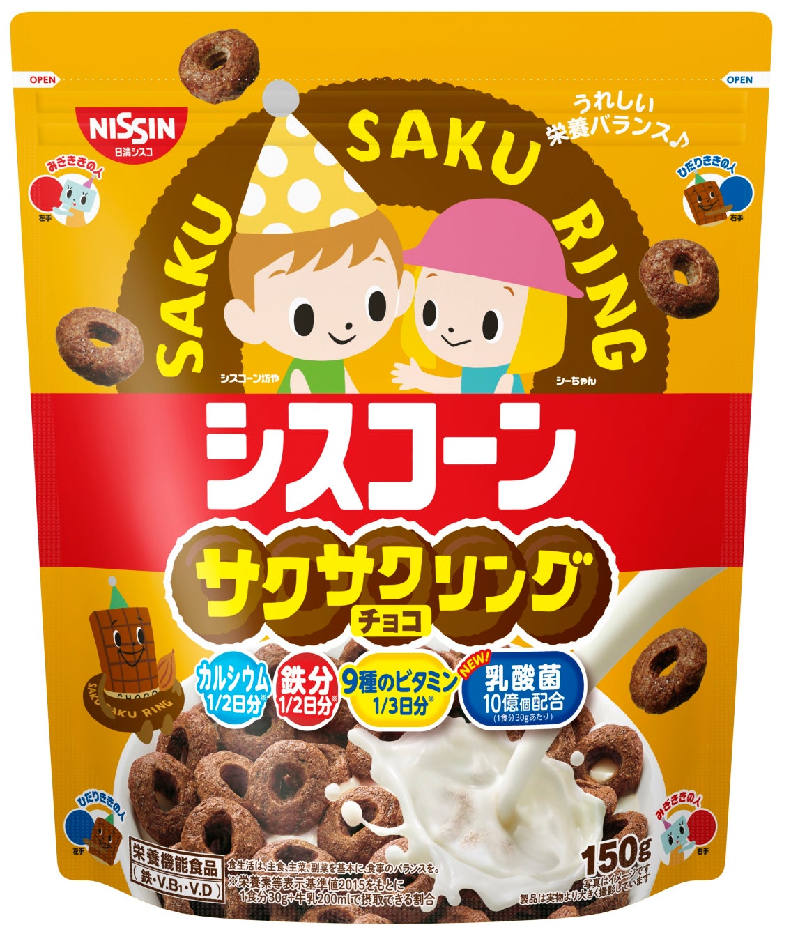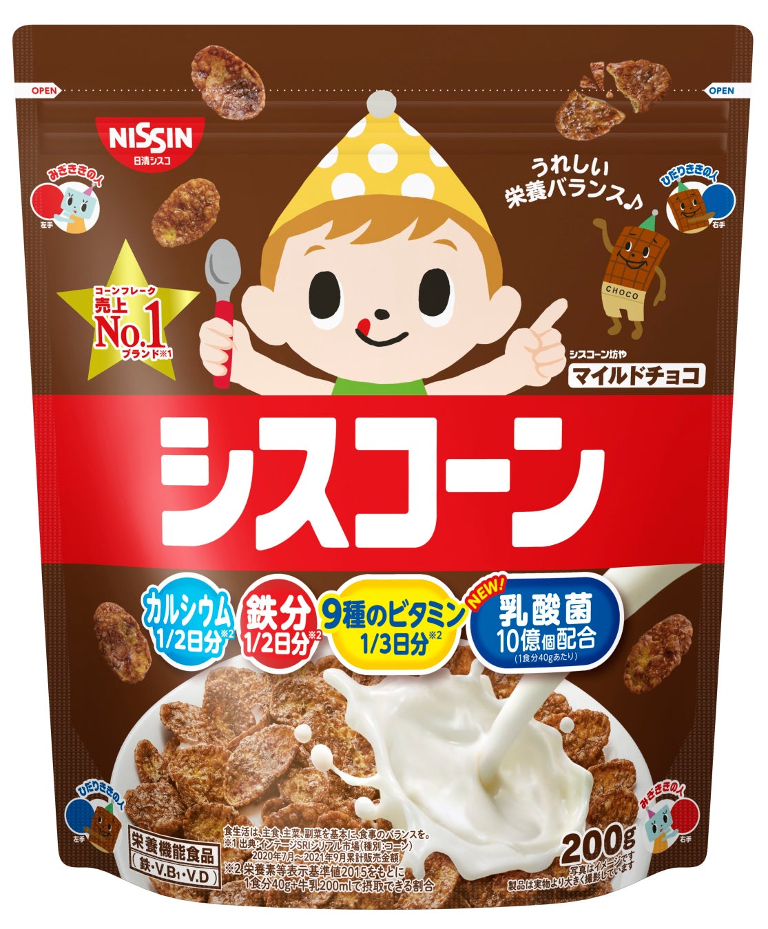 「フロスト」「フロスト 400g」「マイルドチョコ」「サクサクリング チョコ」「サクサクパン風シリアル キャラメル」の5品には、1食分あたり10億個の乳酸菌を配合しました。また、「プレーン」を含む全6品のパッケージを一新し、「シスコーン」のキャラクター「シスコーン坊や」やその妹「シーちゃん」を大きくデザインしました。