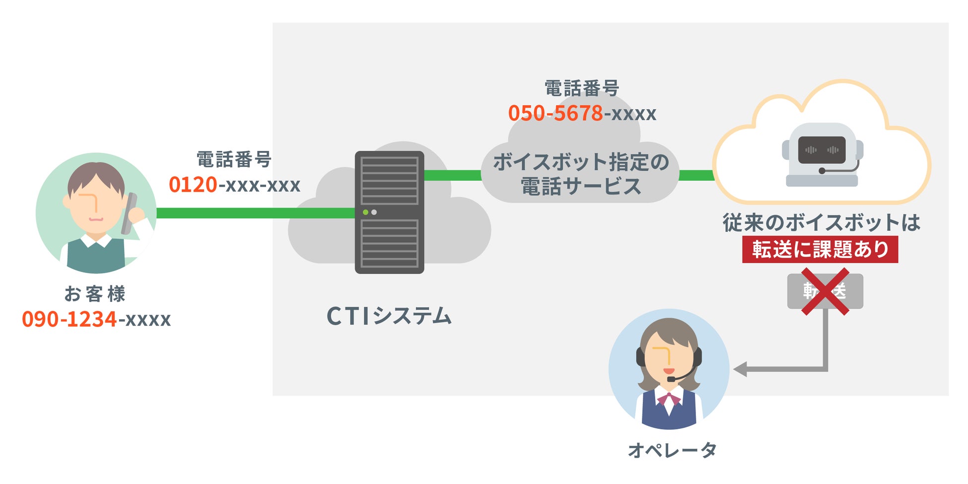 クラウド型 PBX と別の電話サービスで転送されるため、ボイスボットへお客様の電話番号が通知されない