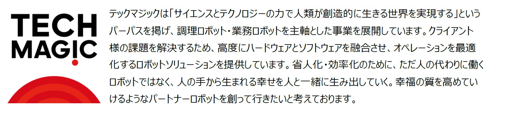 テックマジックは、2018年2月に設立。「サイエンスとテクノロジーの力で人類が創造的に生きる世界を実現する」をパーパスに掲げ、食を取り巻く多くの企業が直面する人手不足を解消し、人がより付加価値の高い業務に従事し、生産性の高い社会を実現するために、最新のAIやロボット技術を高度に融合した各種プロダクトの企画、設計、販売、保守を行っています。