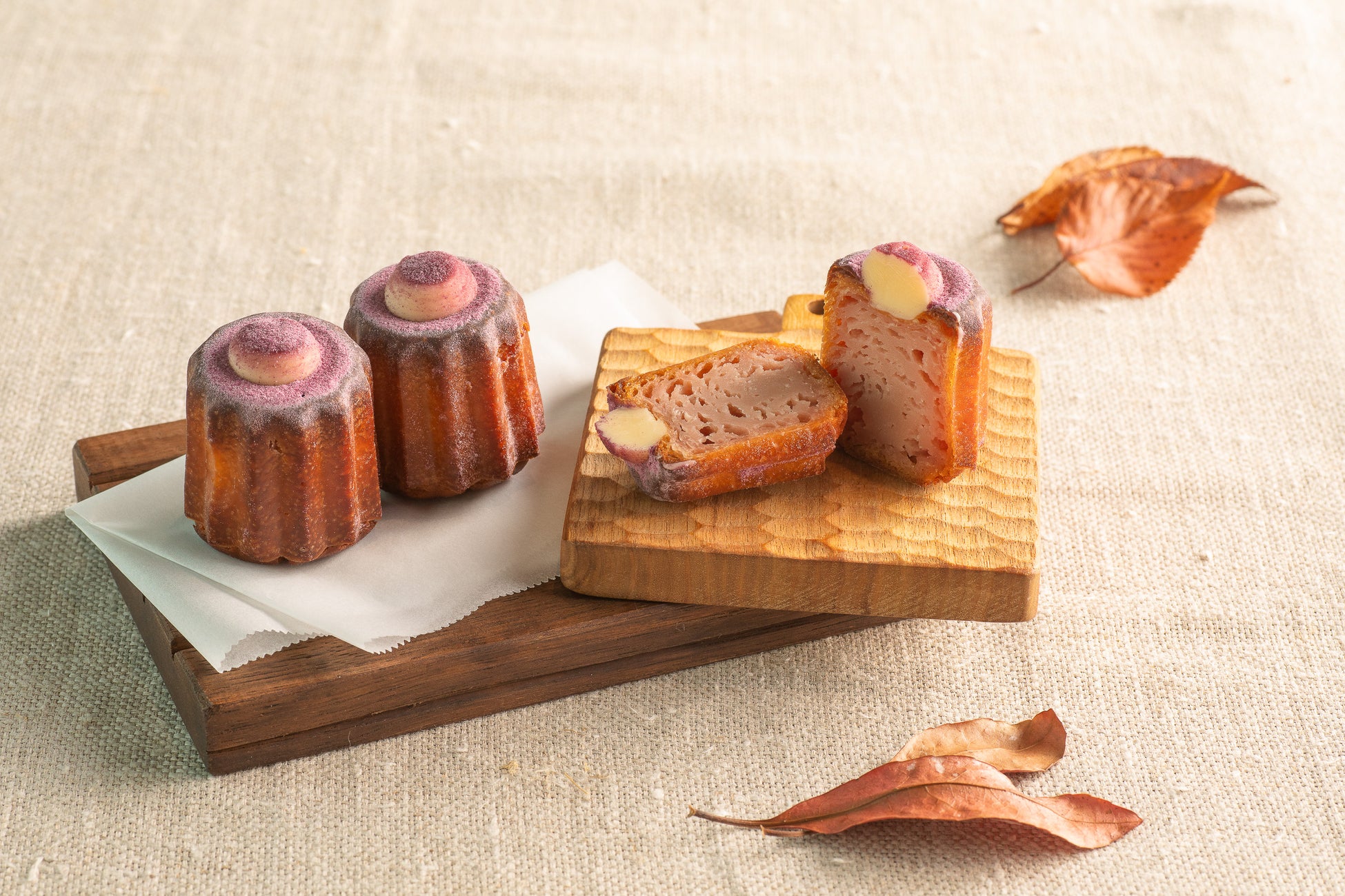 生地には紫芋のペーストを練り込み、紫芋パウダーをトッピングした秋に楽しみたいカヌレ。さらに、メープルシロップとバターを合わせると、ほのかな甘みとバターのコクがまるで焼き芋にバターをのせて食べたようなフレーバーで相性抜群です。