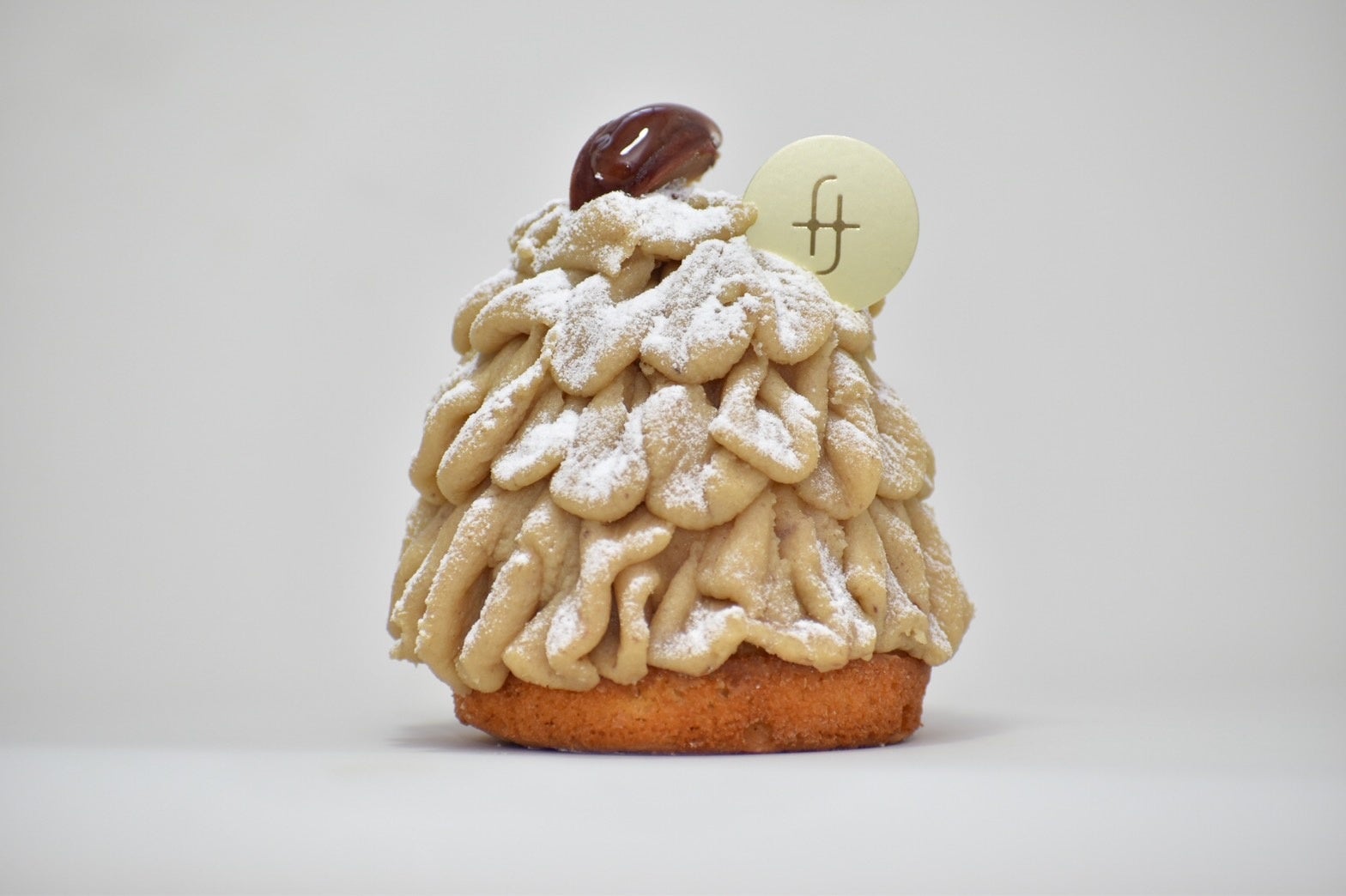 全国の農家や産地を訪ね、こだわりの素材を使用するFRUCTUSの人気のモンブラン。特別にオーダーした2㎜メッシュで裏ごしした、食感の残る口当たりの熊本県阿蘇産の栗ペーストを贅沢に絞り、国産の渋皮栗と生クリームに、しっとりとしたフランジパーヌを合わせました。栗本来の風味を感じていただけます。