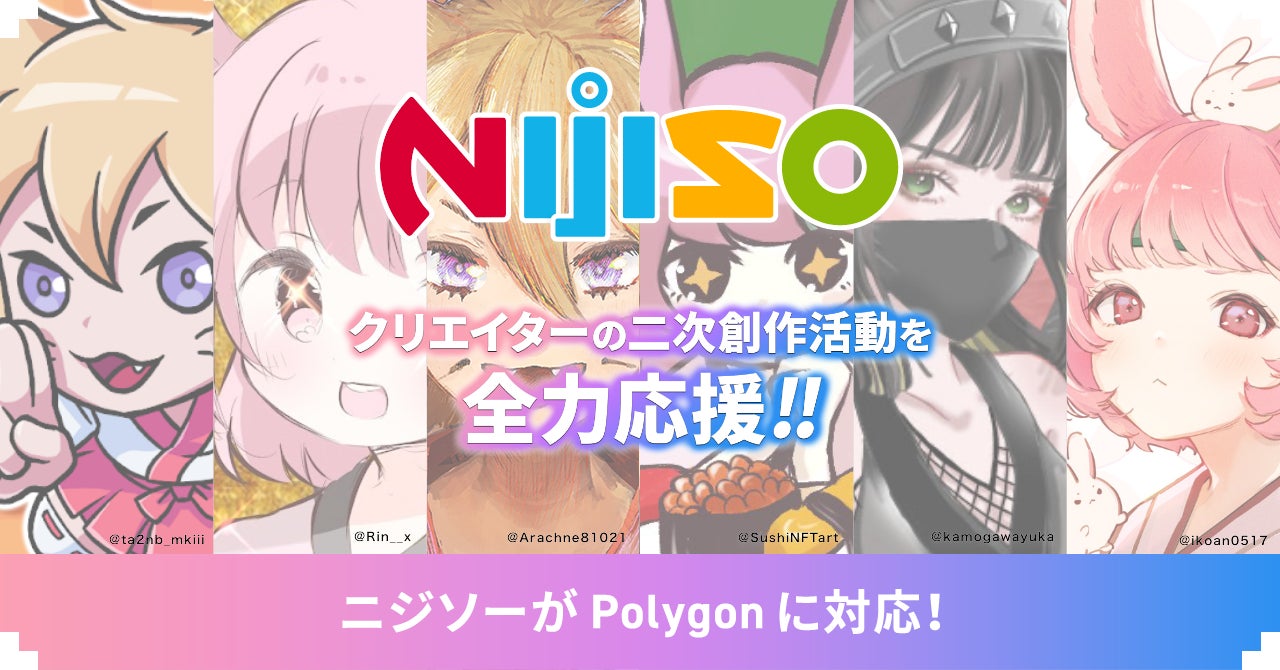 本日、一般社団法人オタクコイン協会・BlockBase株式会社は、クリエイターの二次創作活動を積極的に支援する『ニジソー(https://niji.so)』が、Polygon上でもNFTの生成が可能となり、CryptoNinjaなど、公式公認二次創作NFTでPolygon/Ethereumを選択してNFT化できるようになったことを発表しました。
