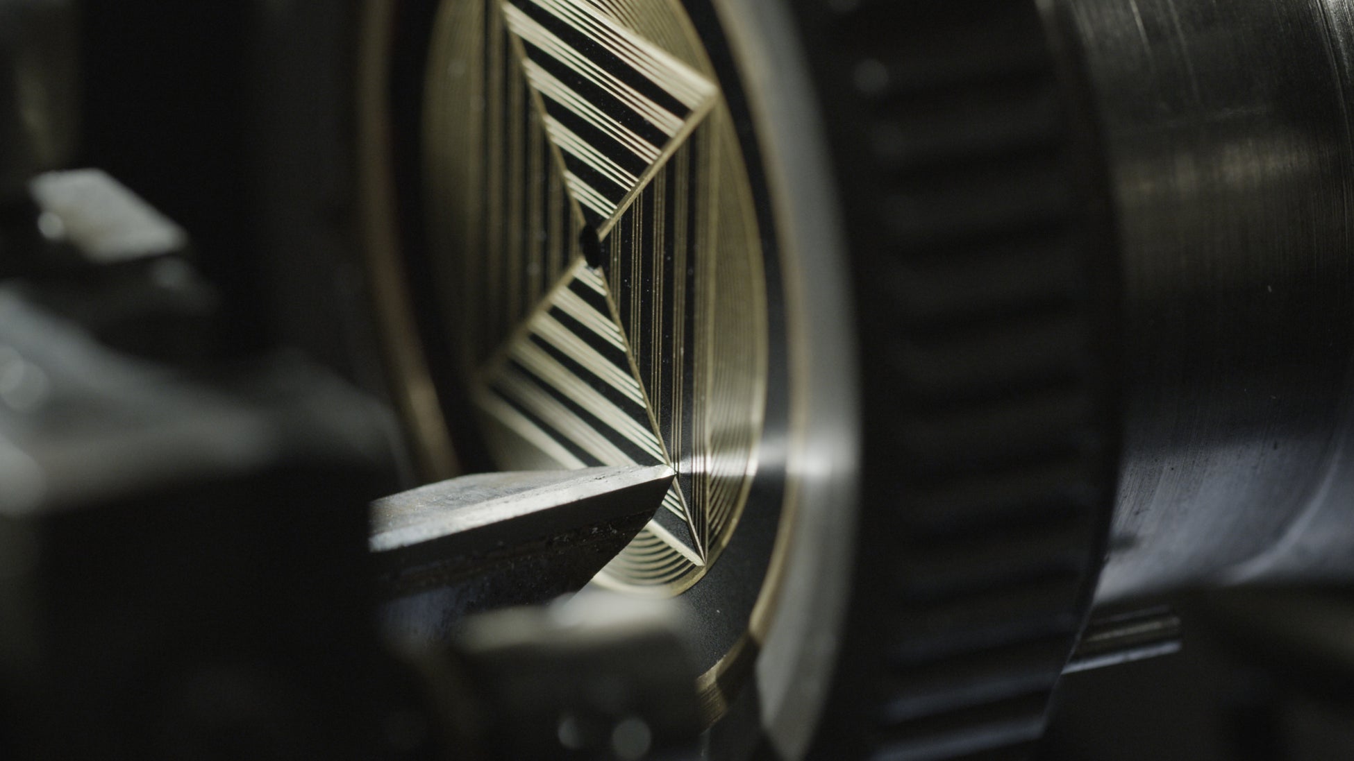 新しいパターンの彫刻を施すため、旋盤のデザインを文字盤のスケールに縮小するのに用いられる金属ステンシルは専用のものを新たに製作しました。