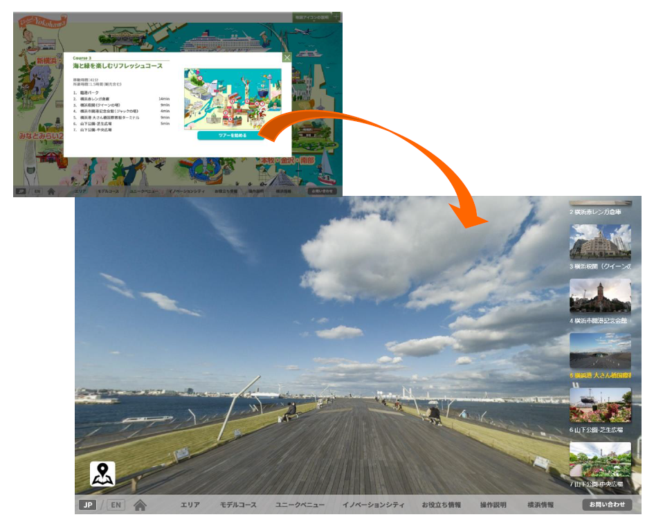 バーチャル横浜では、定番の山下公園などを含む、気軽な海沿いの散歩コースから、横浜の開港の歴史をたどることのできる半日観光コースまで、横浜の良さを感じていただくことのできる、4種のコースをパノラマビューで体験いただけます。横浜へのお出かけプランに、もしくはビジネストリップの合間にも参考にしていただける、選りすぐりのお勧め散策コースを、是非ご覧ください。
