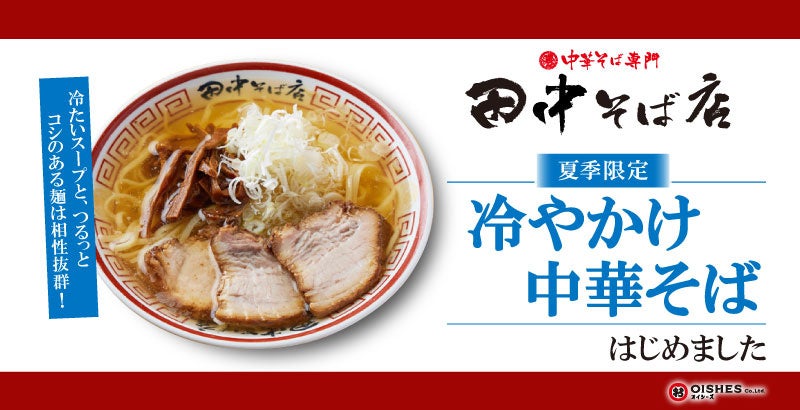 人気飲食店である、つけ麺「つじ田」や江戸前天丼「日本橋 天丼 金子半之助」などをグループで運営するオイシーズ株式会社(所在地:東京都 千代田区 、代表取締役:工藤 智)傘下の株式会社 GMSは、夏季限定メニューの『冷やかけ中華そば』を「中華そば専門 田中そば店」全店にて販売いたします。