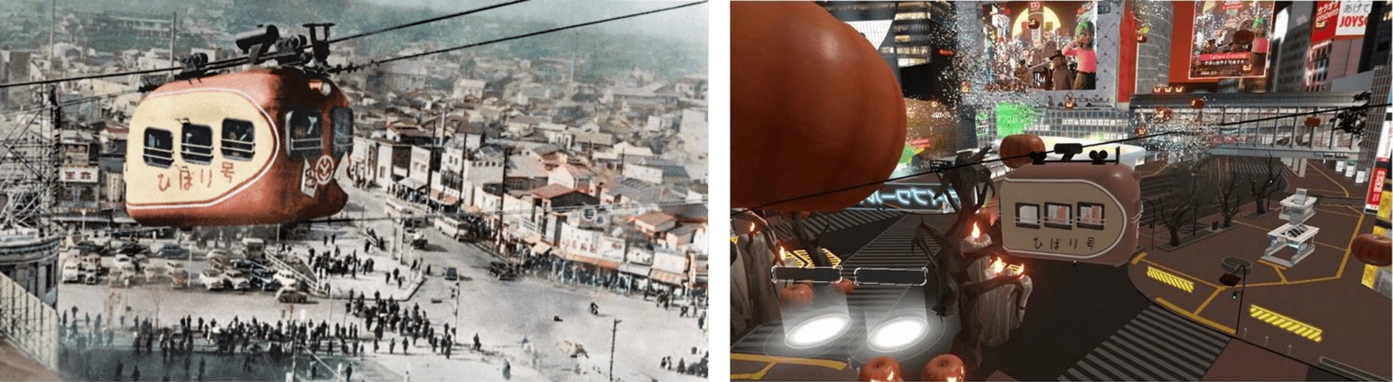 そして、昭和26年からわずか2年間だけ渋谷の街の上空を運航していたケーブルカー「ひばり号」が「バーチャル渋谷」にハロウィーン期間限定で再現されます。実際にケーブルカーに乗車して、「バーチャル渋谷」を空中散歩しながら、ハロウィーン仕様の渋谷の街並みを見下ろすことができるといった、実在都市の仮想空間だからこそできる体験をお楽しみいただけます。さらに、乗車回数1回ごとに、運航当時の運賃10円が実際の渋谷の街に寄付される予定です。