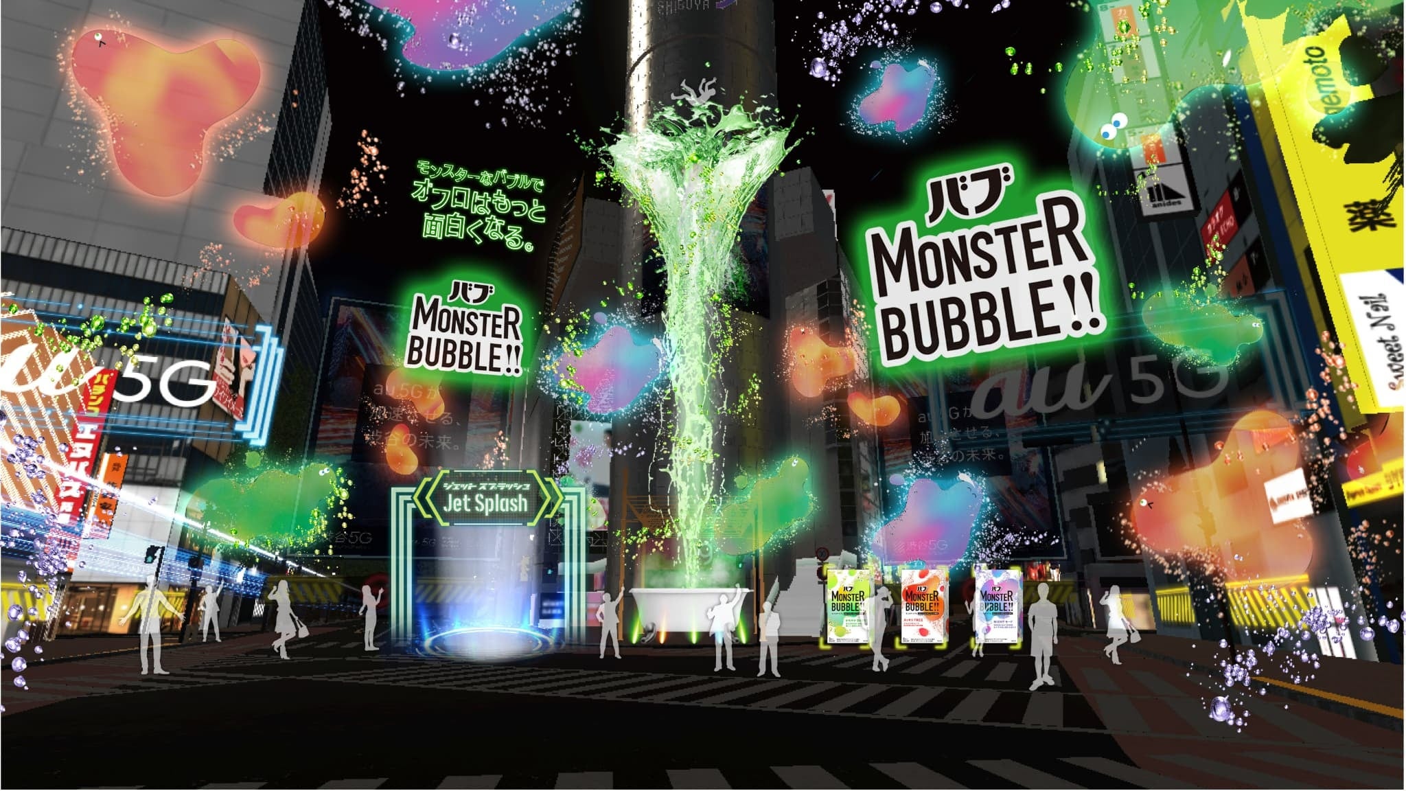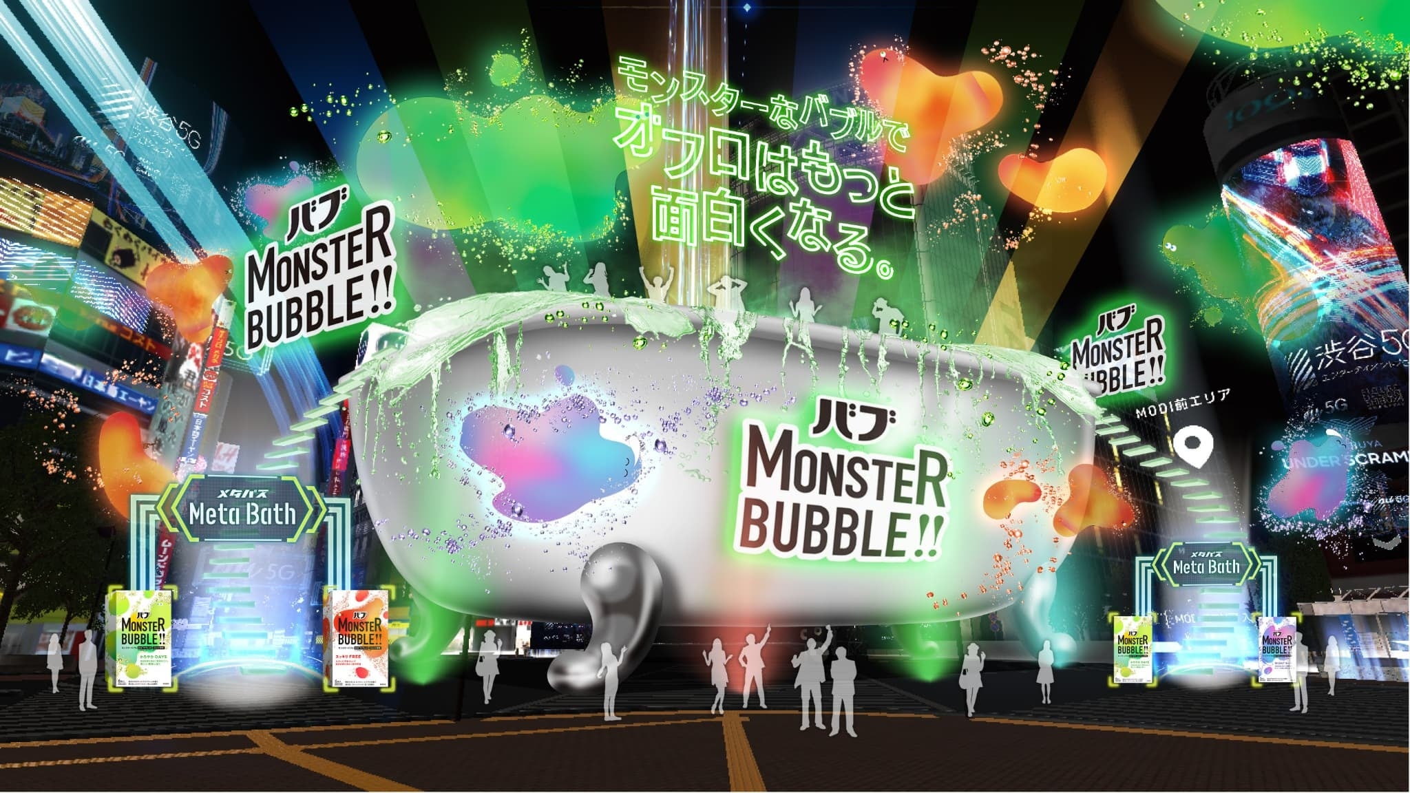 ハロウィーン仕様の「バーチャル渋谷」スクランブル交差点に、メタバース史上最大級の巨大なバスタブが出現。来場者は、巨大なバスタブに浸かって、炭酸のジェット発泡や緑・青・赤と色とりどりに変わる湯面を楽しみながら、幻想的なバーチャル入浴タイムを過ごせます。