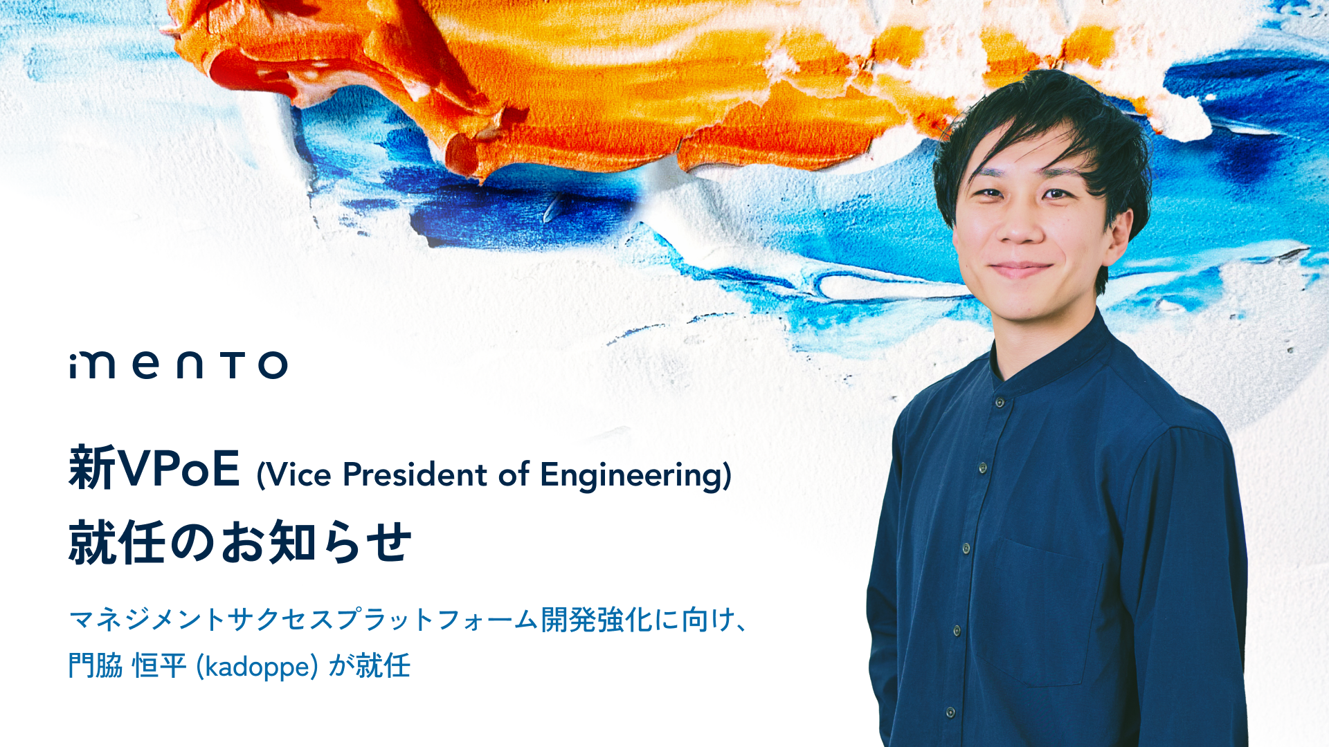 マネジメントサクセスプラットフォーム「mento(メント)」を提供する株式会社mento(本社:東京都港区、代表取締役:木村憲仁、以下mento)は、エンジニア組織のVPoE(Vice President of Engineering)に門脇恒平(kadoppe)が就任したことをお知らせいたします。開発・組織マネジメントを強化し、マネジメントサクセスプラットフォームを実現してまいります。