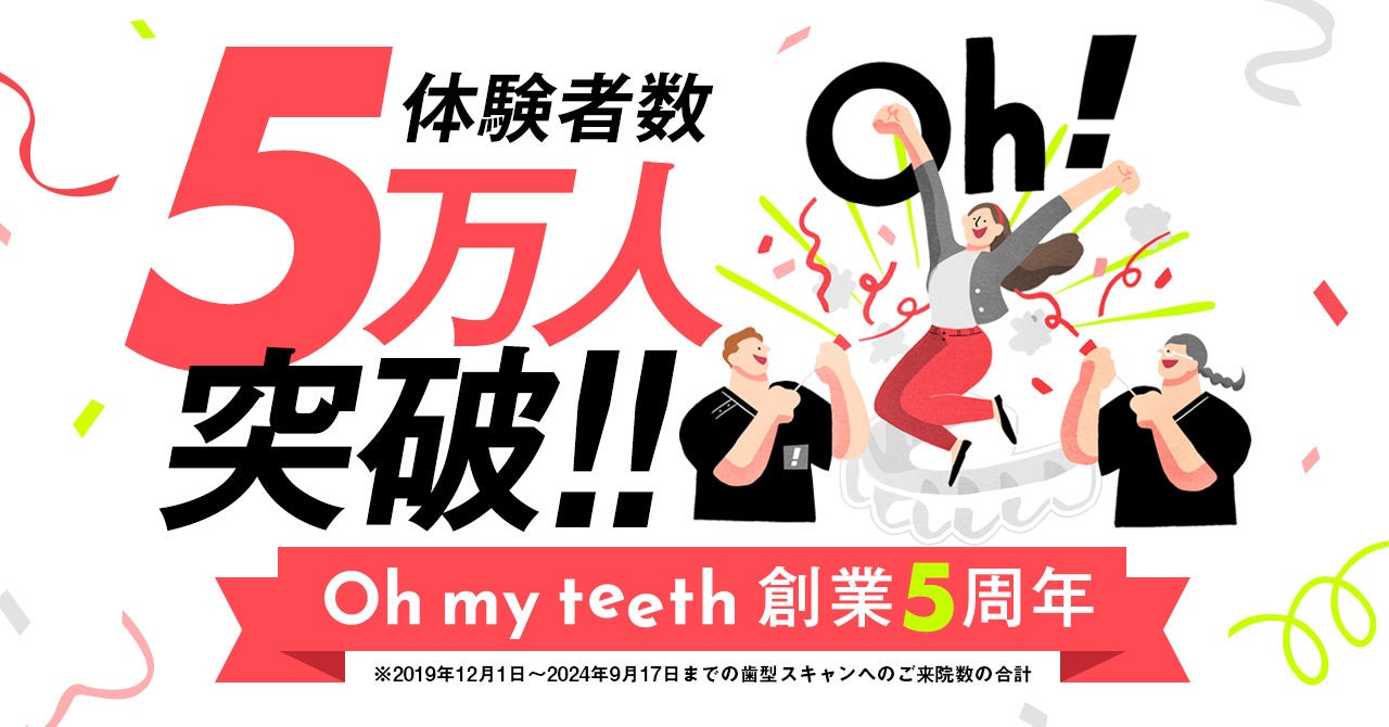 Oh my teethは、2019年10月に設立した「未来の歯科体験を生み出す」をミッションに生まれたオーラルテックベンチャーです。テクノロジーに精通したメンバーと、歯科矯正専門家がタッグを組み、未来の歯科体験を生み出しています。日頃支えてくださっている皆さまのおかげで、2024年10月に5周年を迎える運びとなりました。同時に、体験ユーザーは5万人を突破いたしました。(2019年12月1日〜2024年9月17日までの歯型スキャンへのご来院数の合計)
