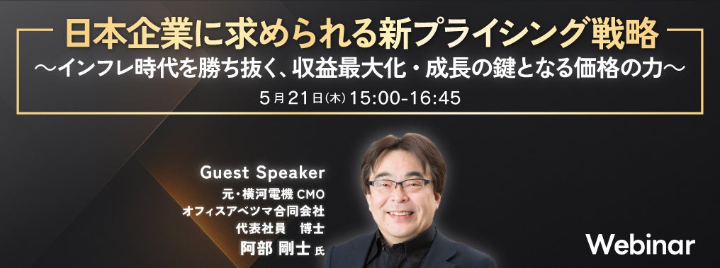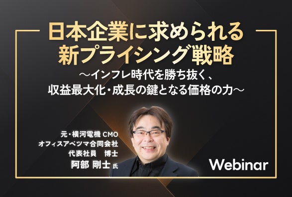 本セミナーでは、横河電機にてマーケティング改革に取り組まれ、企業価値向上や先駆的な組織デザインを主導されてきた 元・横河電機CMO 阿部 剛士氏をお招きし、日本企業が直面する価格戦略の課題を明らかにし、収益最大化を実現するための“価格支配力”の醸成ポイントについてご講演いただきます。