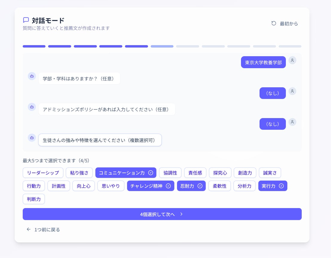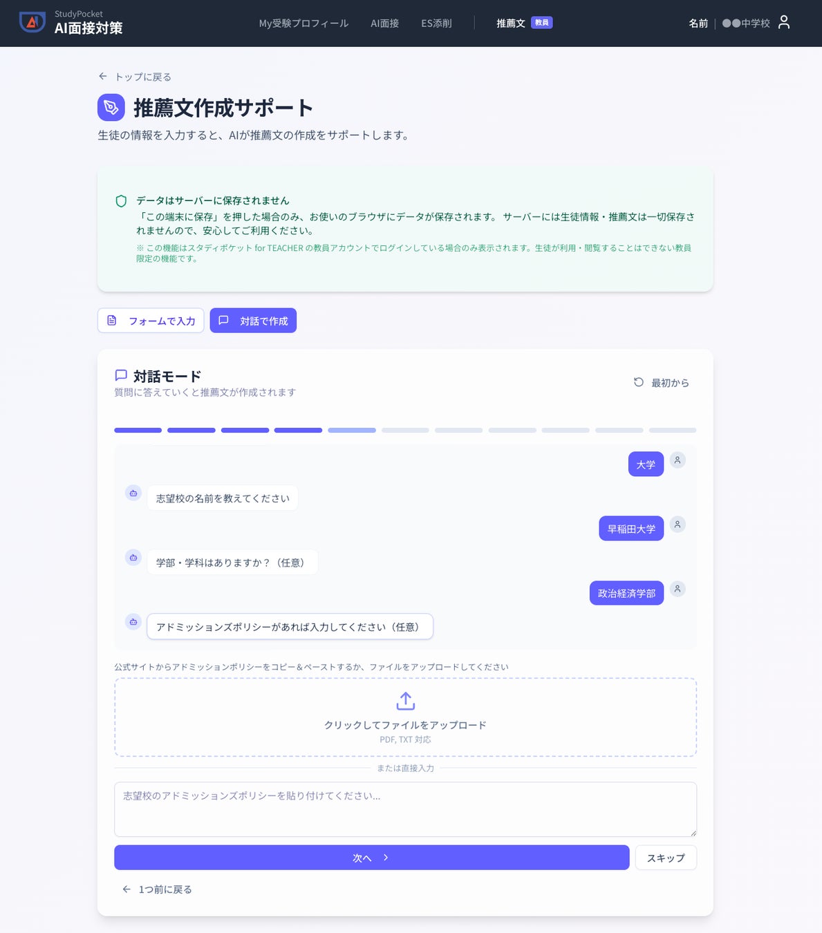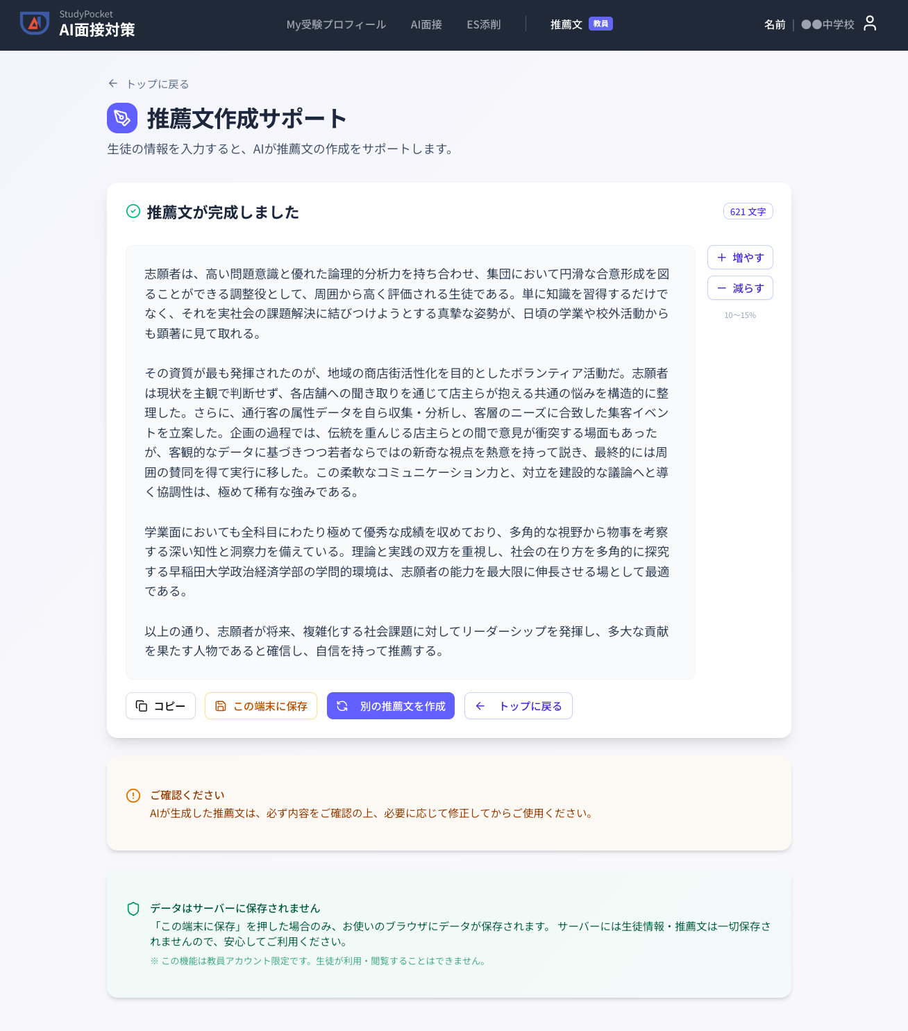 【推薦文作成支援】 生徒の自己PRや志望動機、活動実績をもとに、AIとの対話型のステップをふまえて、AIが推薦文の下書きを作成。教員は下書きをベースに加筆・修正することで、効率的に推薦文を作成できます。