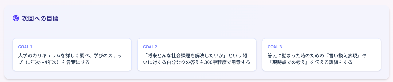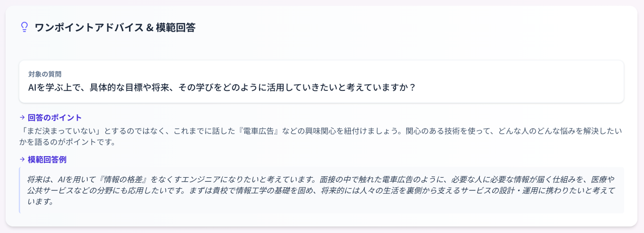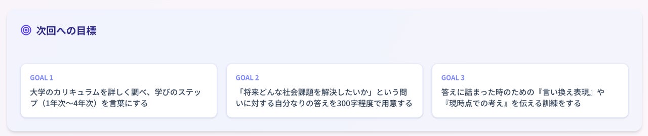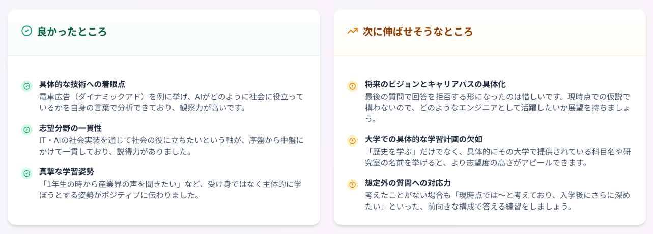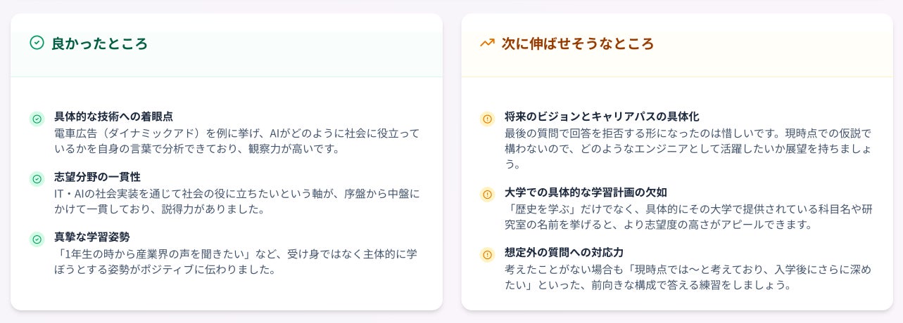 推薦入試や総合型選抜の拡大により、面接対策の重要性は年々高まっています。 一方で、教員が一人ひとりの生徒に十分な時間をかけて面接練習を行うことは、 現実的に難しい状況があります。 私自身、大学受験で面接対策をした経験があり、「本番前にもっと練習したかった」 「自分の回答が客観的にどう聞こえているか知りたかった」という思いがありました。 AI面接対策は、そうした当時の自分が「あったらいいな」と思うものを形にした サービスです。 生徒にとっては、試験前日まで何度でも練習でき、AIから客観的なフィードバックを 受けられます。教員にとっては、基礎的な練習をAIに任せることで、より踏み込んだ 指導や、一人ひとりに寄り添ったアドバイスに時間を使えるようになります。 今回、高性能なAIモデルを組み合わせることで、深掘り質問や的確なフィードバックなど、 実用に耐えるクオリティを実現できました。まずは体験版で、AIとの面接練習を 試していただければ幸いです。