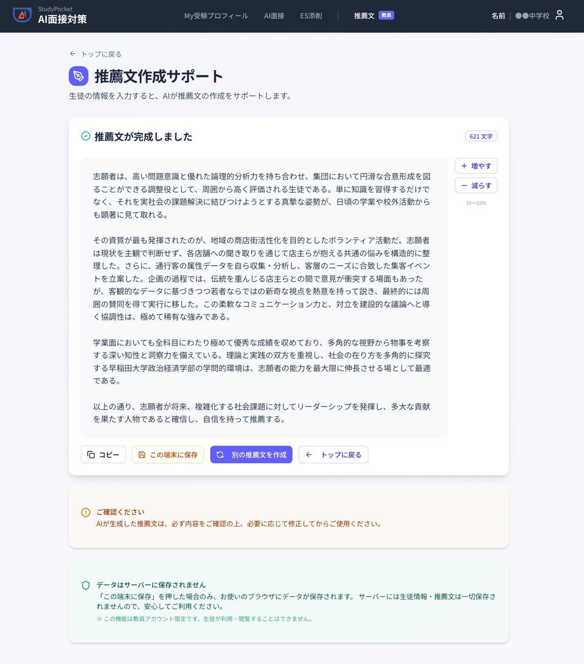 文部科学省「教育情報セキュリティポリシーに関するガイドライン(令和7年3月)」に定められた重要資産の取り扱いに関わるクラウドサービスの観点、ならびに「初等中等教育段階における 生成 AI の利活用に関するガイドライン」の趣旨に基づき、当社サーバーには生徒情報・推薦文の情報は一切保存されず、生成AIの推論時にも学習情報としてオプトアウト設定されています。