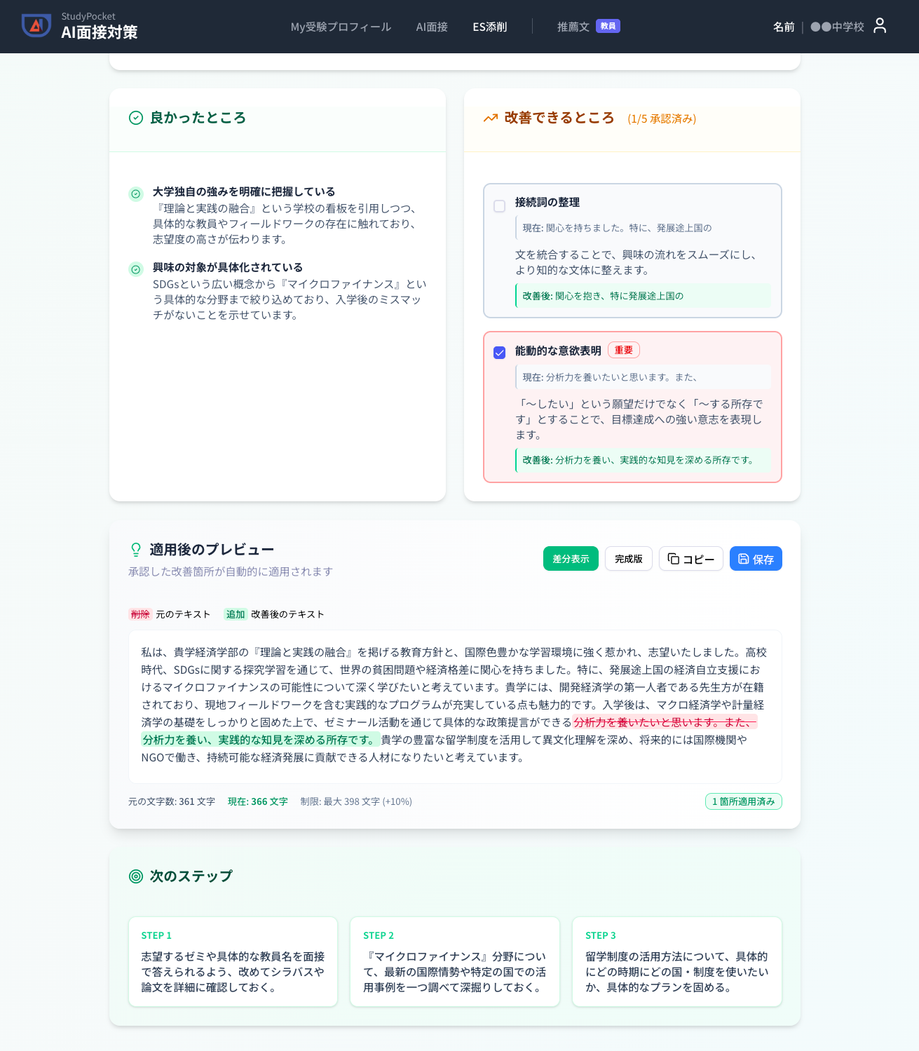 こうした課題に対し「スタディポケット AI面接対策」は、AIがリアルな面接官として生徒の練習相手になることで、いつでも・何度でも面接練習ができる環境を実現しました。さらに、あらかじめ設定しておいた志望動機や自己PRなどの出願書類の内容、志望先のアドミッション・ポリシー(ある場合)に基づいた面接が行われます。これらの書類をAIが添削する機能も搭載し、面接と書類の両面から出願準備をサポートします。