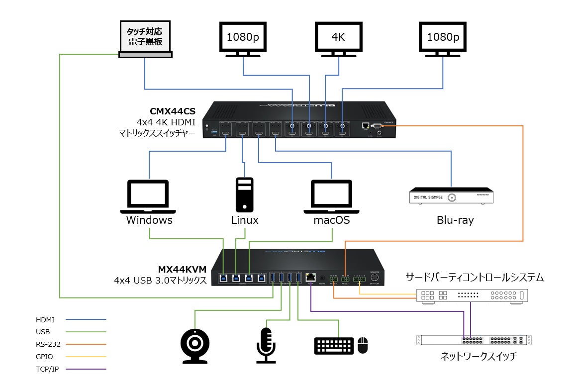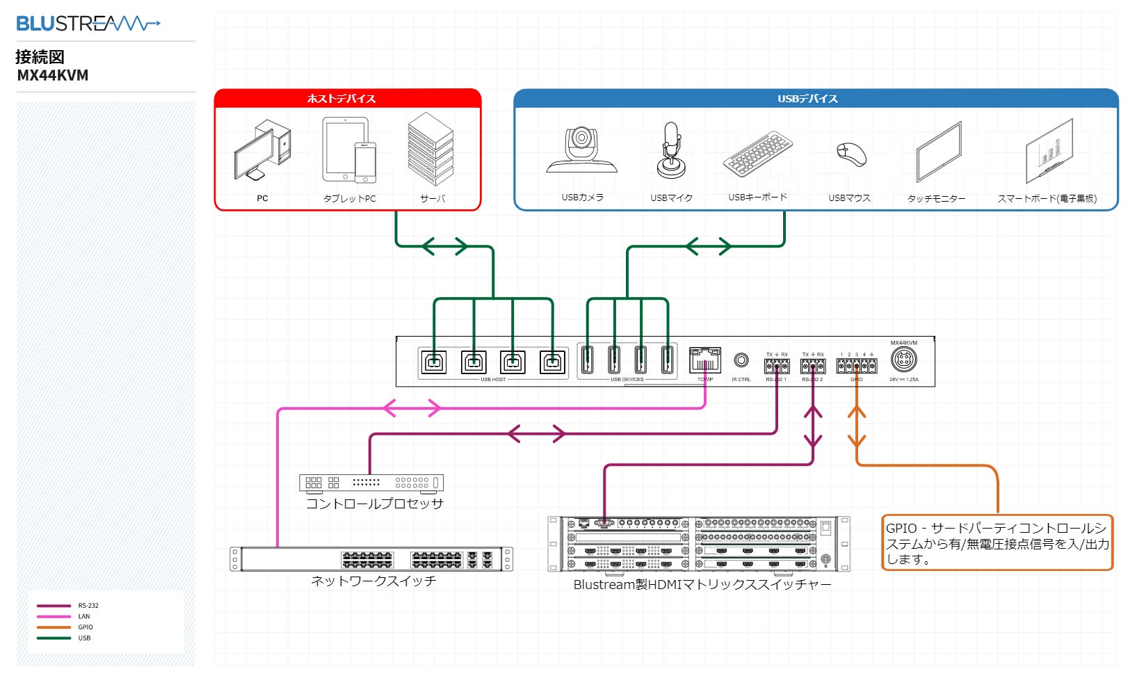 Blustream製品のソース切り替え用RS-232制御コマンドは統一しているため、本機のシリアル(RS-232)通信コマンドパススルー機能で、Blustream製マトリックススイッチャー [型番:MX44VW] 及び [型番:CMX44CS] と連動可能で、USB 3.0信号とHDMI信号を同時に切り替え可能なKVM(Keyboard、Video、Mouse)簡易システムを構築することができます。