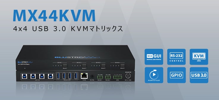 また、シリアル(RS-232)通信コマンドパススルー用ポートを搭載し、Blustream製HDMIマトリックススイッチャー [型番:MX44VW] 及び [型番:CMX44CS] と連動可能で、USB 3.0信号とHDMI信号を同時に切り替え可能なKVM(Keyboard、Video、Mouse)簡易システムを構築することができます。