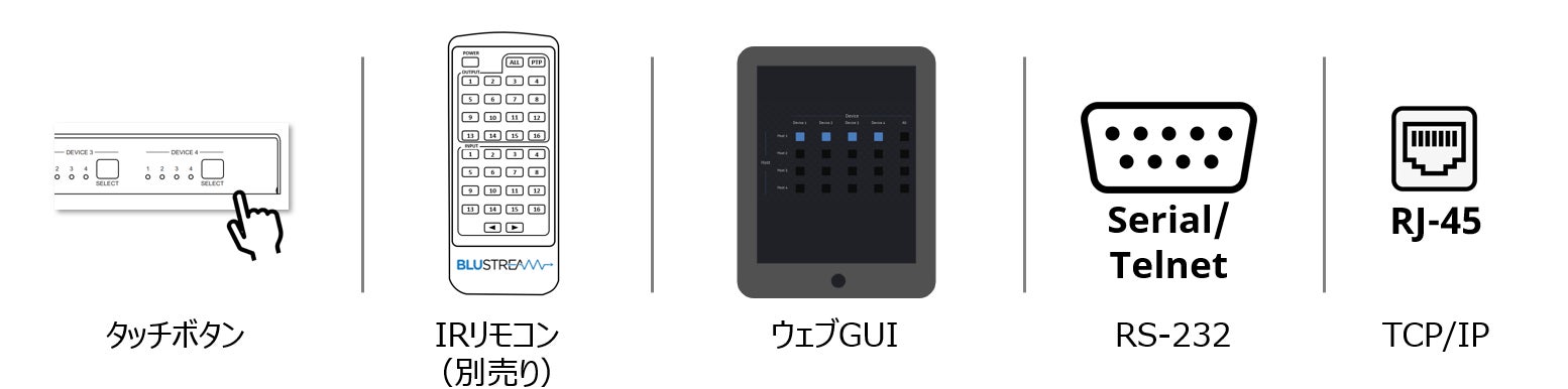 ■ 多様な制御方法|本体ボタン、IR信号、ウェブGUI、RS-232、Telnet