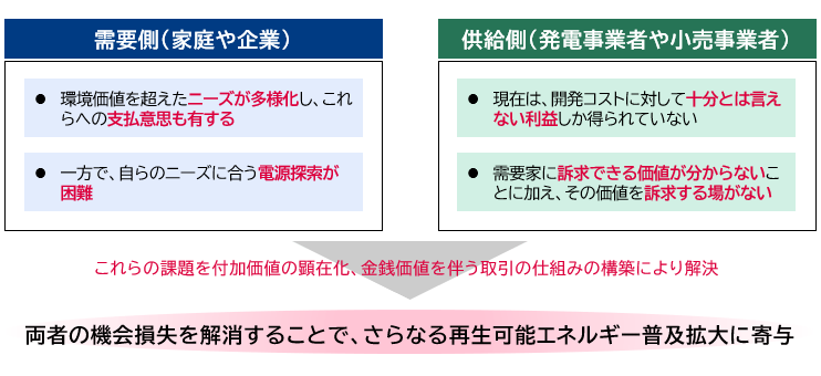 現在、再エネ電力を取引する市場は、多様化する需要家のニーズに対応する付加価値を金銭的な価値として実際に取引できる仕組みになっていません。このことは、需要家にとってはお金を払ってでも欲しい再エネを調達できない、発電側にとってはさらなる付加価値の訴求により期待される利益を得られないということであり、両者にとって機会損失となっている可能性があります。