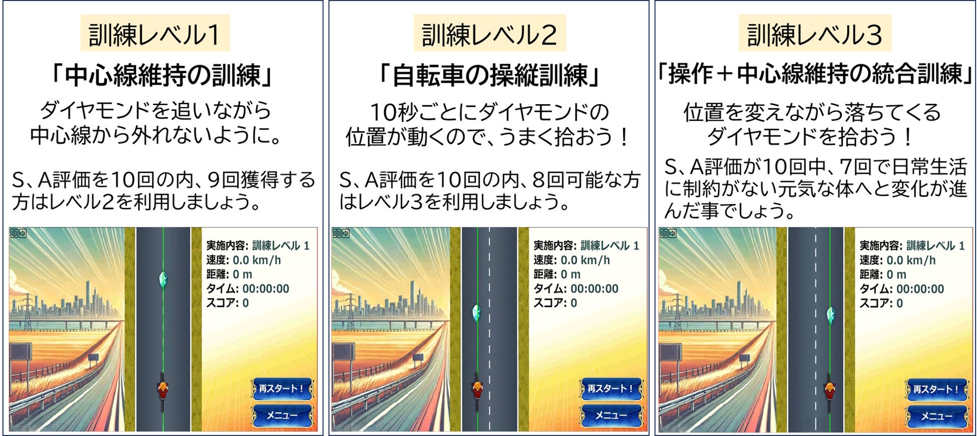 訓練プログラムは、3つのゲームモード「訓練レベル1」「訓練レベル2」「訓練レベル3」を活用します。