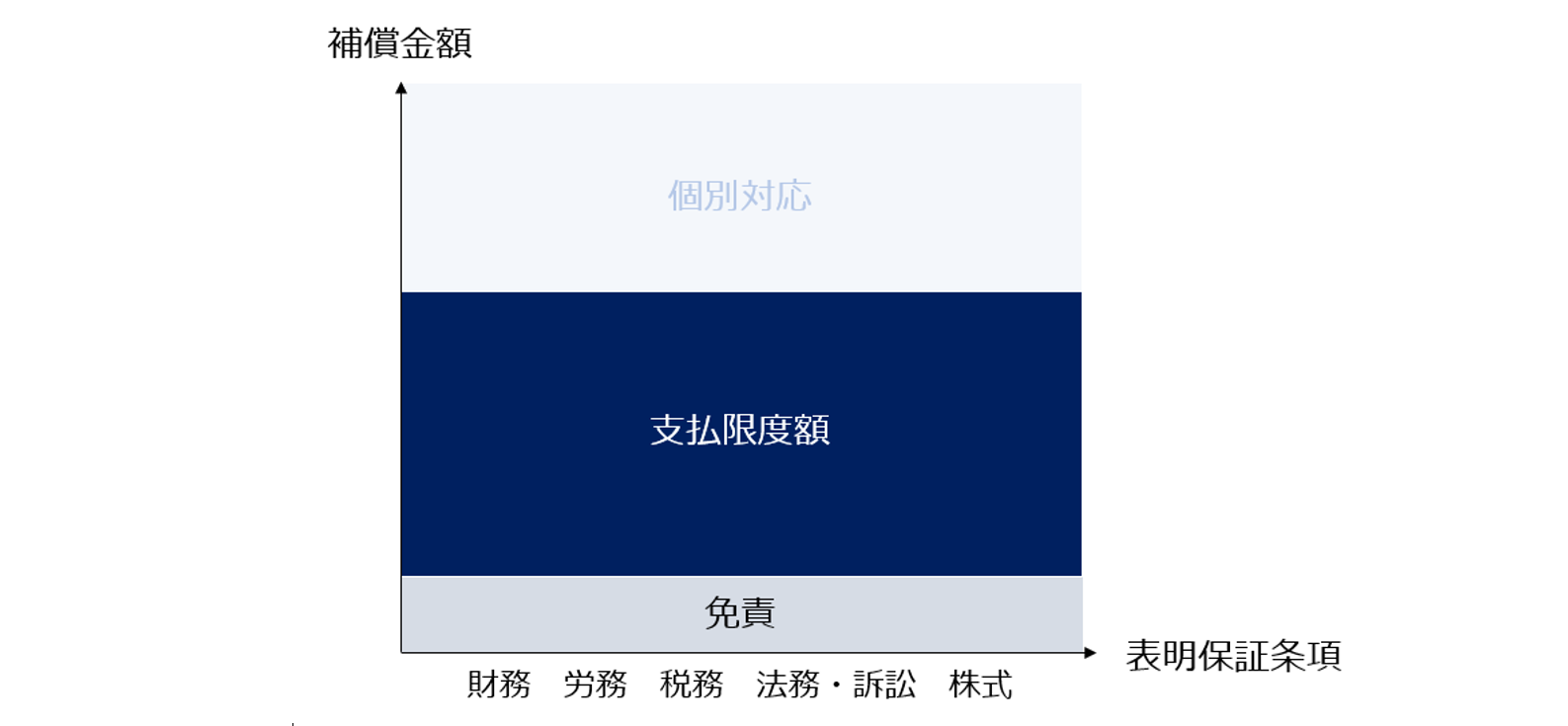 売主が譲受企業に対して、例えば、譲渡企業の計算書類は正確であることを表明保証し、万が一その計算書類に誤りがあった場合に譲受企業が補償を受けることで、安心してM&Aを実行できるという枠組みです。具体的には、M&A実行後に簿外債務が発覚し、かつ譲受企業に損害が生じた場合、売主は損害額を補償しなければなりません。
