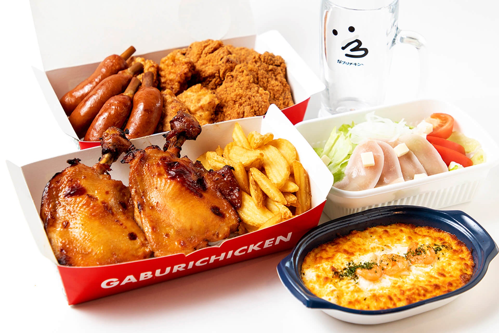 からあげもも4個、クリスピーチキン4個、テリヤキチキン2本、骨付きフランク4本、クリスパーズポテト200g、えびグラタン、鶏生ハムサラダ、予約特典:がブジョッキ