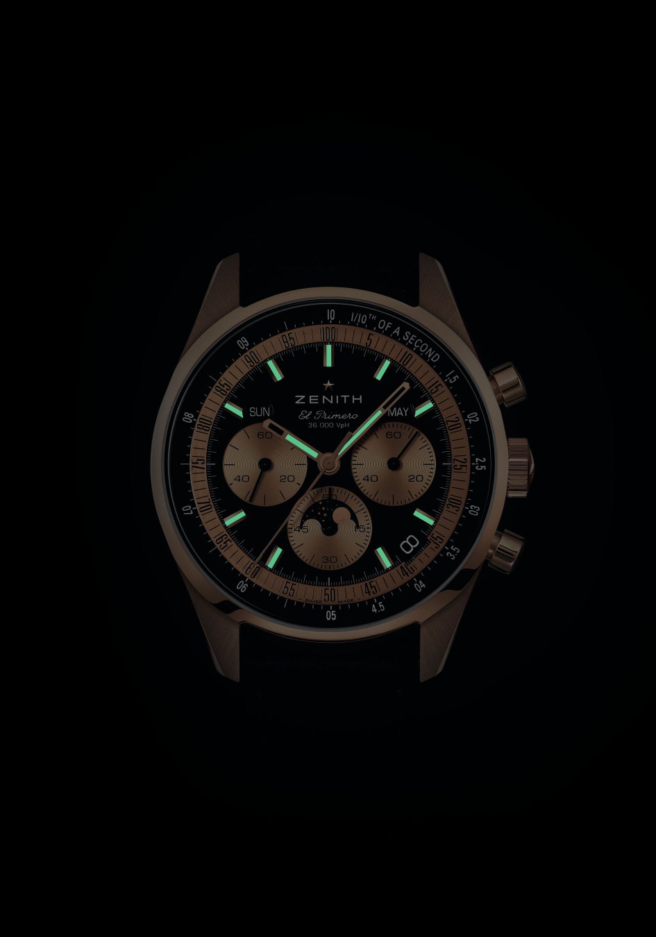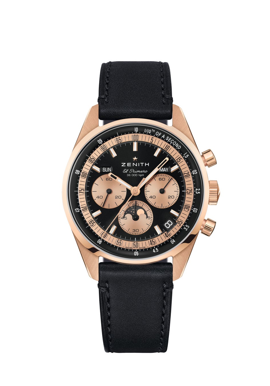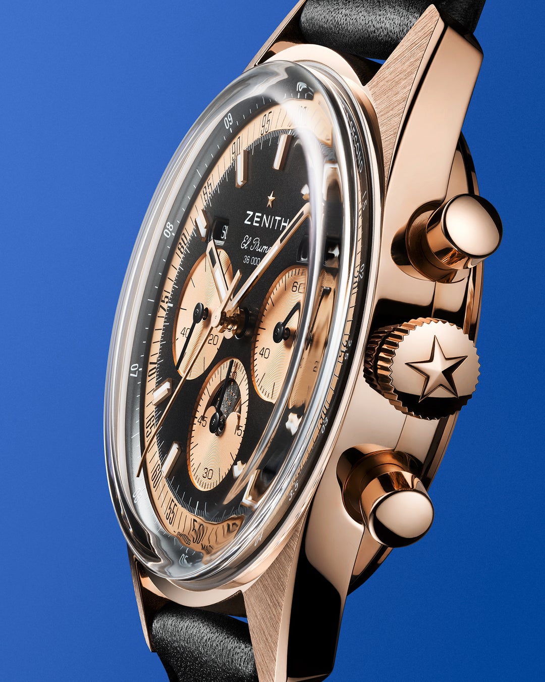 ローズゴールド製の「クロノマスター オリジナル トリプルカレンダー」には、18K ローズゴールド製フォールディングバックルが付いたブラックのカーフレザーストラップが付属しています。ゼニス ブティックとオンラインブティック、および世界中の正規代理店にて販売されます。