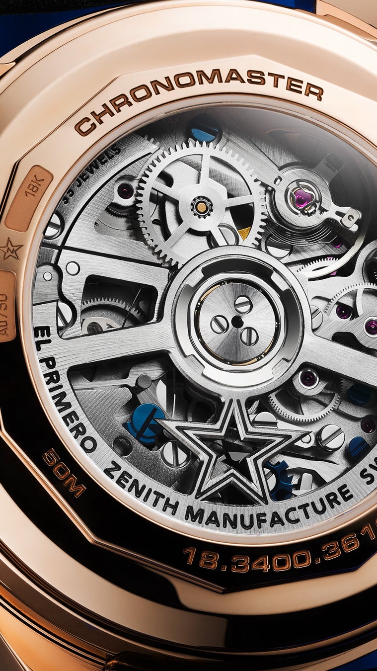 「クロノマスター オリジナル トリプルカレンダー」は自動巻キャリバー エル・プリメロ 3610を搭載しています。伝説的なゼニス クロノグラフの現代的なモデルは、真の1/10秒の計測を可能にします。チャプターリングの目盛り上で1/10秒が精確に表示され、5Hzの高振動を最大限に活かすことで、クロノグラフ秒針は従来の60秒ではなく、10秒で文字盤を1周します。コンプリートカレンダー機構を追加されても尚、パワーリザーブは60時間を維持しました。サファイアガラスのシースルーの裏蓋からは、ブルーのコラムホイールとゼニススターがあしらわれたオープンローターを含め、ムーブメントの一体化構造を眺められます。