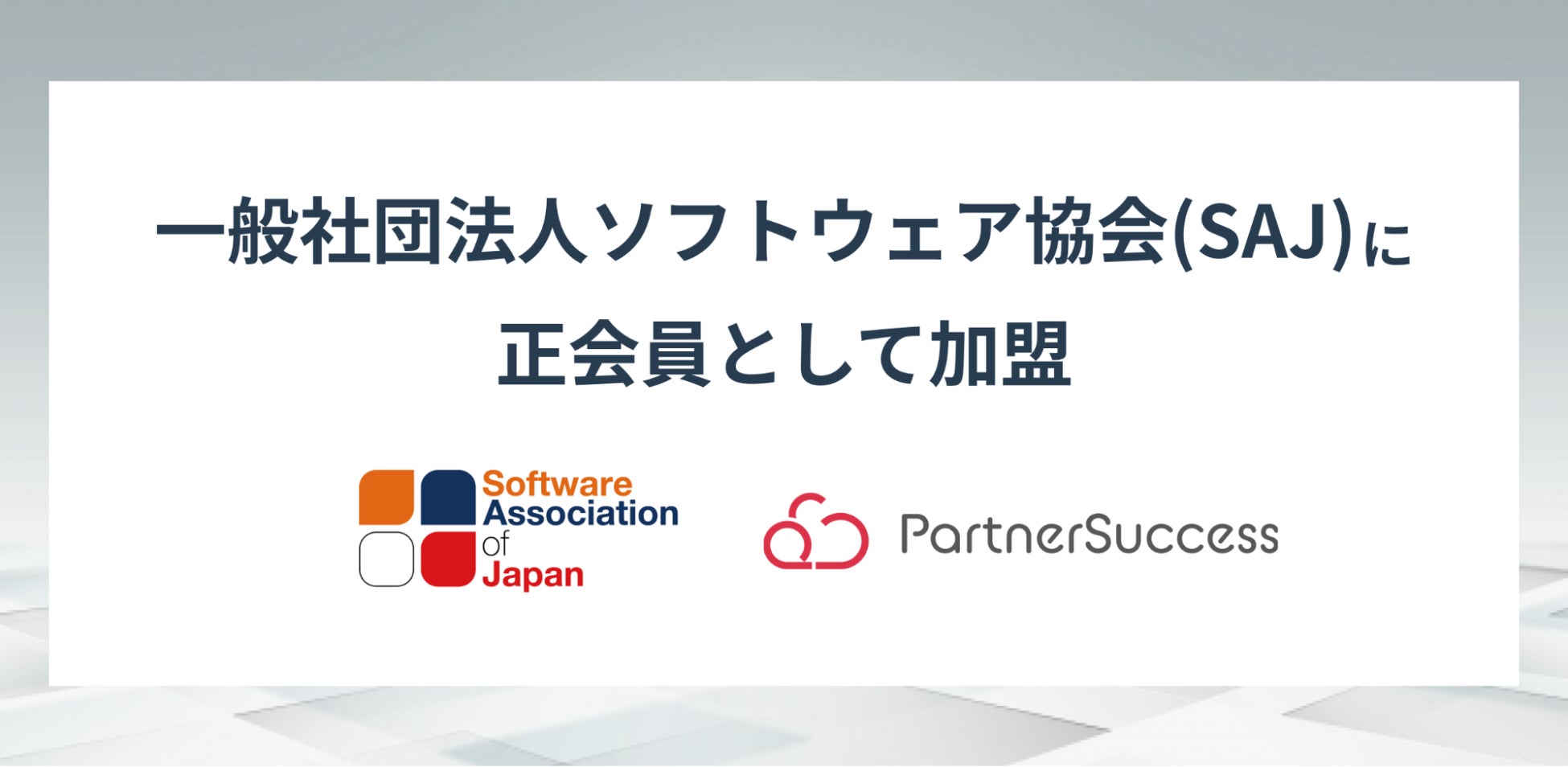 この度パートナーサクセスは、一般社団法人ソフトウェア協会(SAJ)の正会員に加盟いたしました。当社はこれまで、「アライアンスをハックする」を経営理念とし、代理店連携管理クラウドPartnersuccessの提供により、企業の代理店販売を支援しITの普及に努めてまいりました。今回の加盟により、一層ITの社会的普及と活用促進に向けた活動に取り組んでまいります。