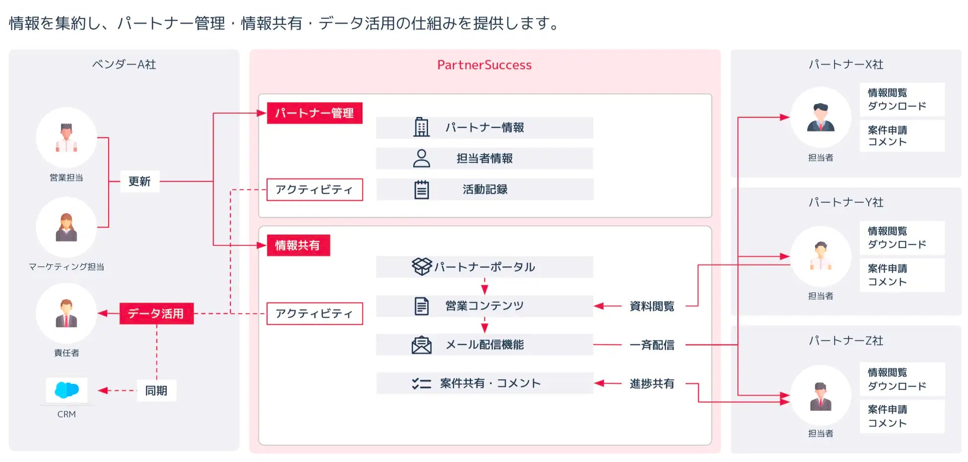 「PartnerSuccess」は、代理店管理・情報共有・データ活用の仕組みを構築し、代理店販売で業績を伸ばす、PRMクラウドサービスです。