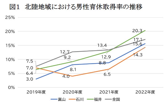 北陸地域は、全国と比較し、男性育児休業取得率が低い傾向があります(図1参照※1)。育児休業取得率が高い企業ほど、求人応募において有利に働くことが考えられることから、男性育休の推進は、人材獲得にもつながり、競争優位性の観点からメリットが多いほか、従業員のエンゲージメントの向上や、離職率の低下、残業削減にも寄与することが明らかになっています(※2)。